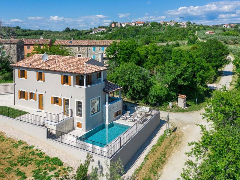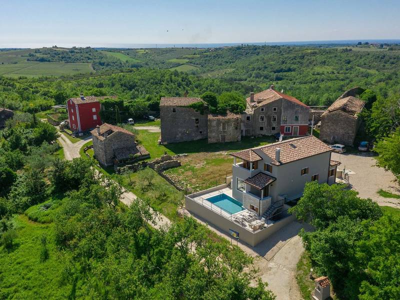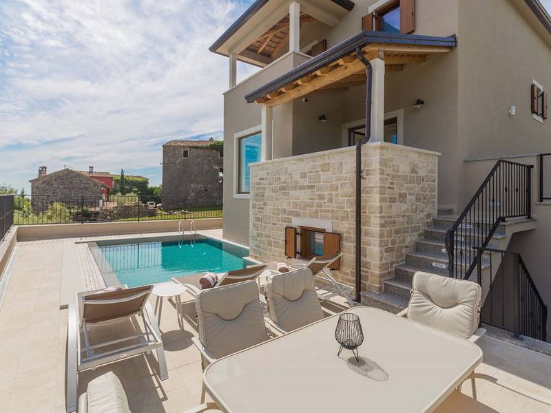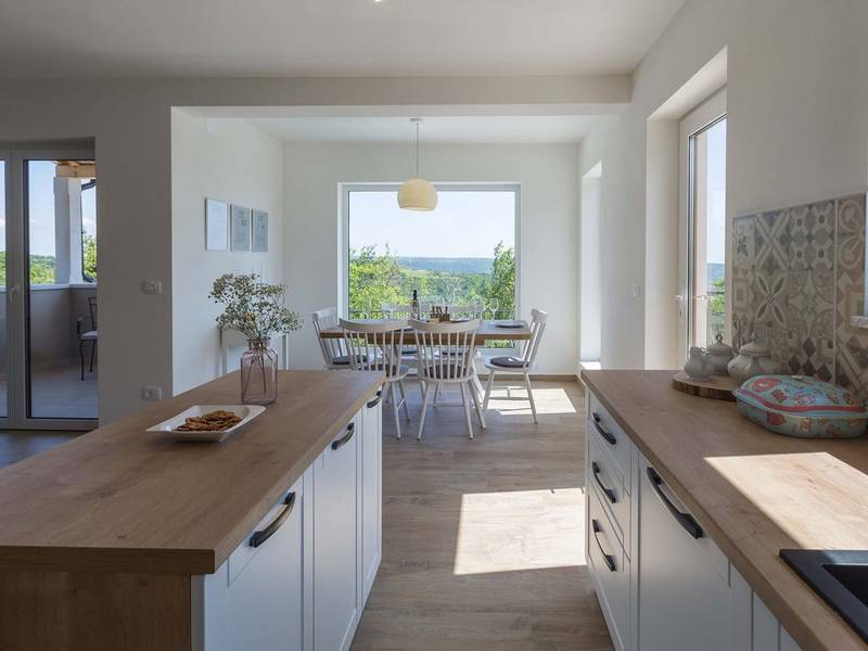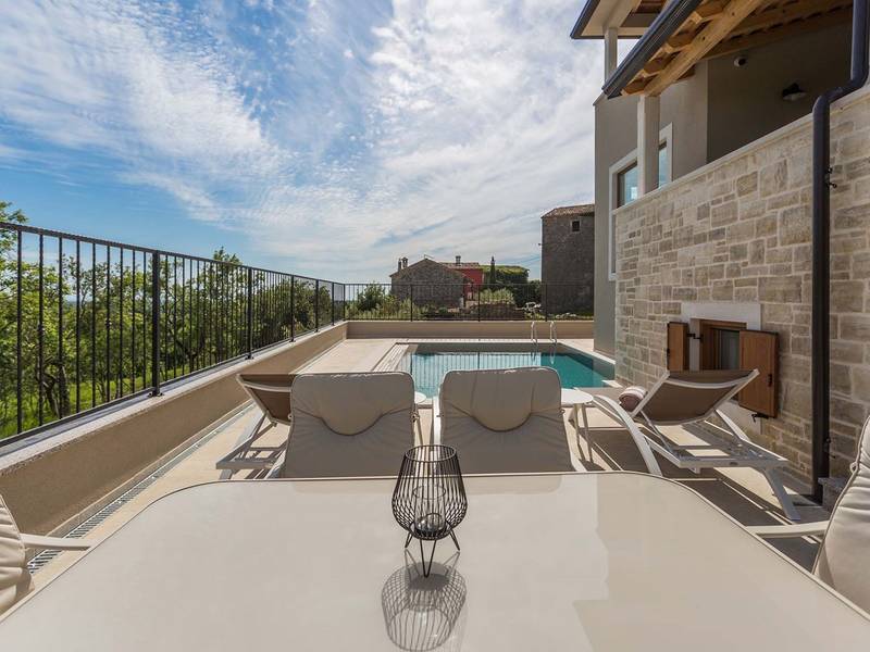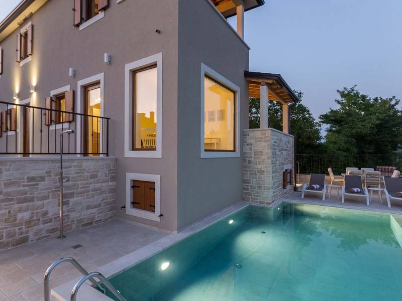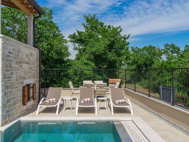 Villa Skarline is gelegen in een plaats genaamd Baredine, in de buurt van de Istrische stad Buje beroemd om de wijnbouw. Het meest dominante kenmerk van dit vakantiehuis voor 6-8 personen is het prachtige uitzicht op het Istrische landschap. De pasteltinten van het lichte interieur geven dit huis een rustgevend en ontspannend effect. Verschillende vintage elementen (zoals theepot met kopjes, koffiemolen, antieke keukentegels etc.) roepen oude romantische tijden op. De villa is omringd door oude huizen met de originele Istrische architectuur. Het huis bestaat uit twee verdiepingen met drie slaapkamers met badkamers, een woonkamer en een eetkamer met keuken. Aan de buitenkant ligt een 27 m2 groot zwembad met zonneterras, zomerkeuken en veel groen. Sommige accommodaties laten geen jeugdgroepen toe. Als je een accommodatie boekt als groep jongeren, neem dan contact op met ons agentschap voordat je de reservering maakt om te controleren of de gevraagde accommodatie jullie verblijf toestaat.