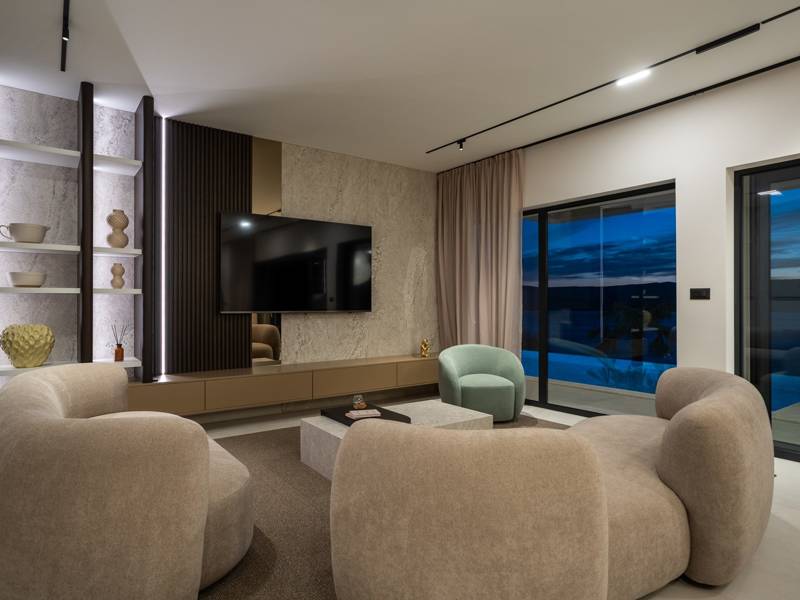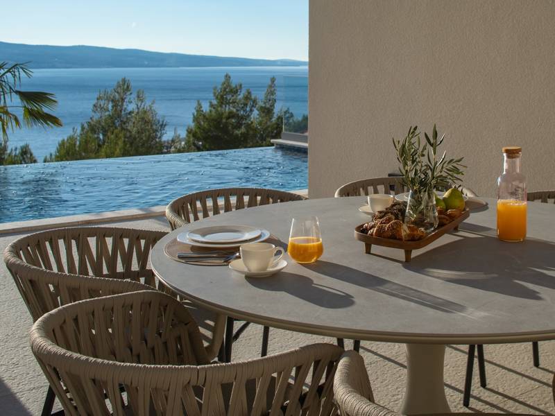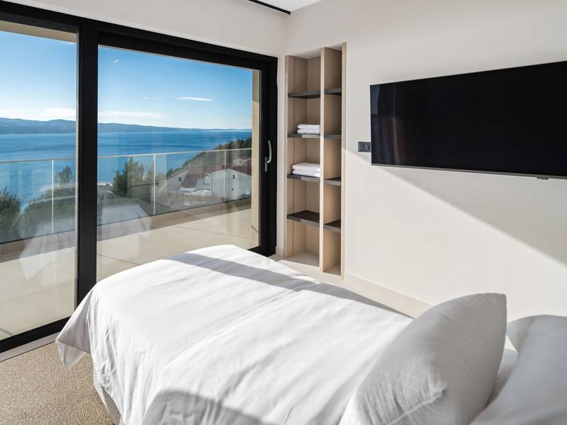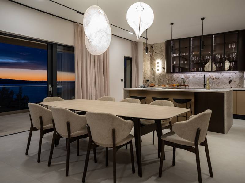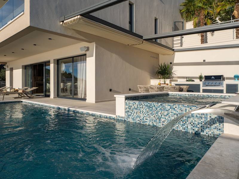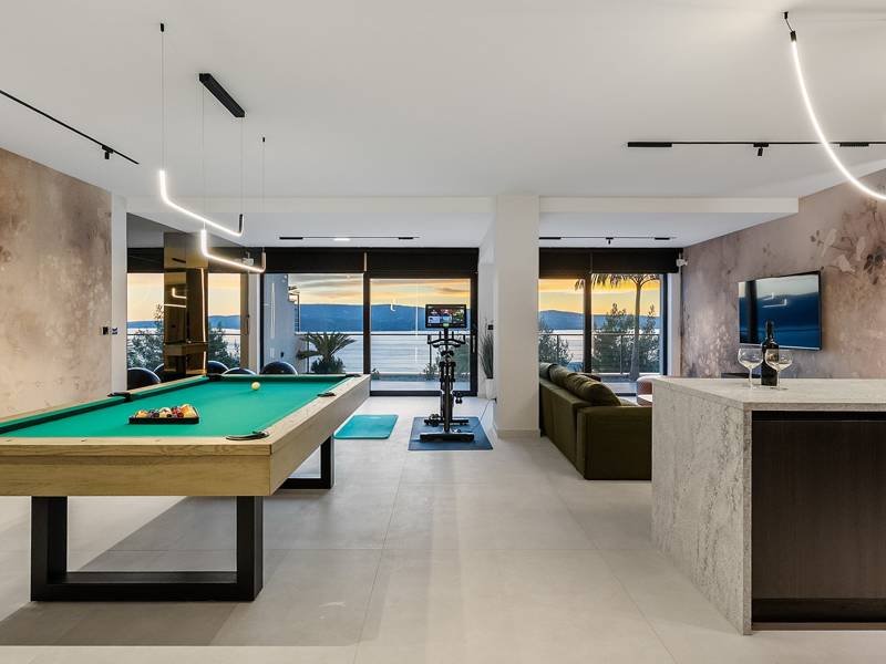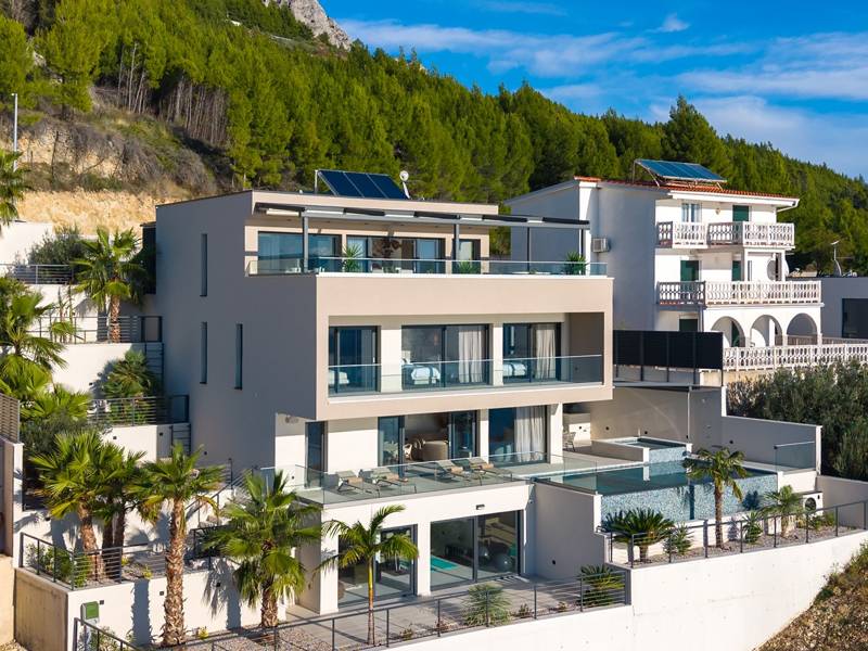 Ervaar ongeëvenaard comfort, privévoorzieningen en adembenemende vergezichten over de Dalmatische kust in dit prachtige luxe toevluchtsoord Ontdek de prachtige en werkelijk luxueuze Villa Million Dreams met 5 slaapkamers, die een verwarmd overloopzwembad van 40 m² met een aangrenzend hydromassagegedeelte, een jacuzzi (whirlpool) op het bovenste terras, een volledig uitgeruste fitnessruimte, een Finse sauna, een biljarttafel en hoogwaardig meubilair biedt. Deze villa heeft een spectaculair uitzicht op zee vanuit elke kamer. Het is ingericht zoals de naam al doet vermoeden - uitzonderlijk ingerichte kamers, zeer comfortabele bedden, meubilair van topkwaliteit en uitgerust met alle moderne voorzieningen voor een zeer comfortabel verblijf, waaronder gratis WiFi, volledige airconditioning en een surround sound-systeem. De villa is verdeeld over vier verdiepingen, met 500 m² binnenruimte op een helling, waardoor je vanuit elke kamer een adembenemend uitzicht op zee hebt. Het is een omheind privéterrein van 650 m². - Vanaf de grote parkeerplaats leidt de hoofdingang naar de villa, waar je op het bovenste niveau de grote slaapkamer, nr. 1, vindt met een terras dat beschikt over een bubbelbad, twee ligstoelen, een loungehoek en een spectaculair uitzicht op zee. De hoofdslaapkamer zelf is 30 m² en heeft een kingsize bed (180cm x 200cm), een tv, airconditioning en een glazen schuifdeur die uitkomt op het jacuzziterras. De en-suite badkamer heeft een vrijstaand bad, een douche, dubbele wastafels en een toilet. Het terras kan in de schaduw worden gezet voor privacy en comfort - Een niveau lager dan de parkeerplaats liggen vier extra slaapkamers, elk met een eigen badkamer en uitzicht op zee. Slaapkamer nr. 2 is 21 m², met een queensize bed (160cm x 200cm), tv, airco en een terras met uitzicht op zee. Slaapkamer nr. 3 is 19 m², met twee eenpersoonsbedden (90cm x 200cm) die gekoppeld kunnen worden tot een kingsize bed, een tv, airconditioning en een terras met uitzicht op zee. Slaapkamer nr. 4 is 20 m², met een queensize bed (160cm x 200cm), tv, airco en eigen douche, en uitzicht op zee. Slaapkamer nr. 5 is 24 m², met een kingsize bed (180cm x 200cm), tv, airconditioning, en-suite douche, en uitzicht op zee. - De overdekte woon- en eetkamer, 65 m² op zwembadniveau, beschikt over een volledig uitgeruste keuken met alle benodigde apparatuur, waaronder een ijsmachine, een grote vriezer, koelkast, wasmachine, DeLonghi espressomachine, magnetron, broodrooster, waterkoker, en nog veel meer. Er is een kookeiland en een stijlvolle eettafel. De woonkamer is ingericht met comfortabele banken, een tv met satellietzenders en grote glazen schuifdeuren van vloer tot plafond die in verbinding staan met de buitenruimtes. Een binnentrap leidt naar de spa en funzone, die 77 m² beslaat en toegankelijk is via zowel een binnen- als buitentrap. Deze zone bevat een kitchenette met een kleine koelkast, vriezer, vaatwasser, gootsteen, glazen en borden, evenals een kookeiland. De overdekte entertainmentzone heeft een biljarttafel, een gezellige bank met tv en een fitnessruimte met een multifunctioneel apparaat, hometrainer, gewichten, Pilates-bal en yogamatten. Tot de wellnessvoorzieningen behoren een Finse sauna met een inloopdouche en een apart toilet. Er is ook een wasruimte met een wasmachine, droger, strijkplank en strijkijzer. - Het buitengedeelte biedt een verwarmd privé overloopzwembad van 8m x 4m, met een gezond elektrolytisch filtersysteem, een zwemprogramma met tegenstroom, een waterval en een aangrenzend hydromassagegedeelte. Het zwembad ligt op het derde niveau, net onder de woonkamer en keuken, en is omringd door een zonneterras met acht ligstoelen en palmbomen, aangevuld met een buitendouche. De eethoek buiten, overdekt voor schaduw, is voorzien van een gasbarbecue en biedt plaats aan tien personen, allemaal met een spectaculair uitzicht op zee. Voor extra veiligheid heeft de villa videobewaking bij de ingang en parkeergelegenheid voor maximaal zes auto's-twee in de garage en vier buiten. Maak uw verblijf nog aangenamer met de persoonlijke services die worden aangeboden door Feriehome, zoals boodschappenbezorging, privékoks voor culinaire ervaringen, ontspannende massages in de villa door professionele masseuses, zeilavonturen met een schipper langs de Adriatische kust en boottochten met gids om de prachtige eilanden van Midden-Dalmatië te verkennen. In Villa Million Dreams is elk detail samengesteld om een onvergetelijke ontsnapping te garanderen waar luxe en comfort elkaar ontmoeten te midden van een prachtig uitzicht. Uw droomvakantie begint hier. Welkom in Villa Million Dreams!