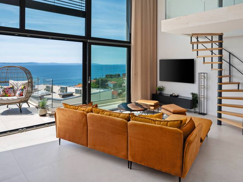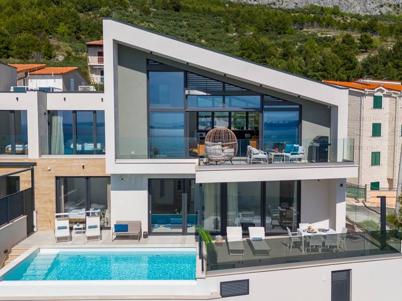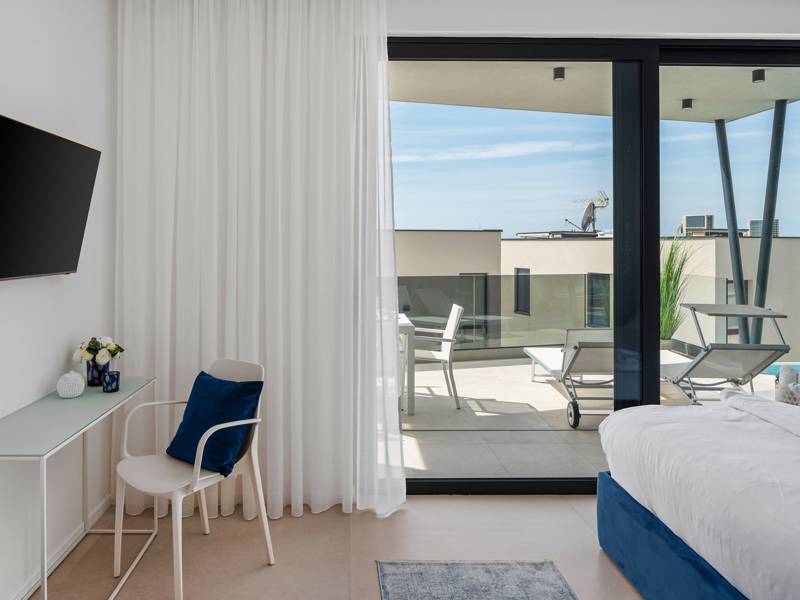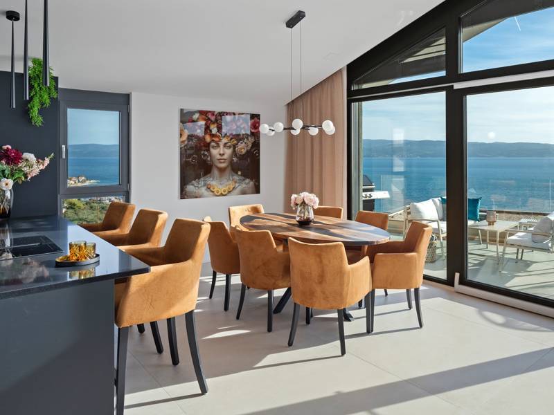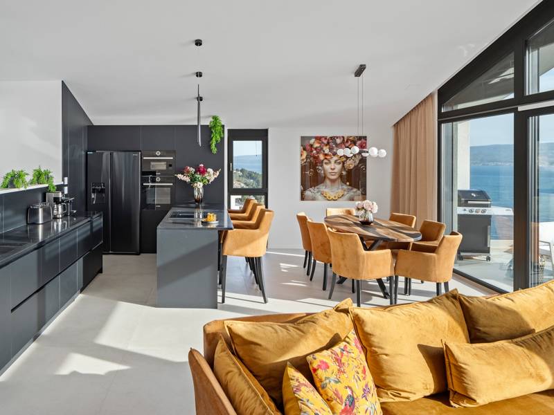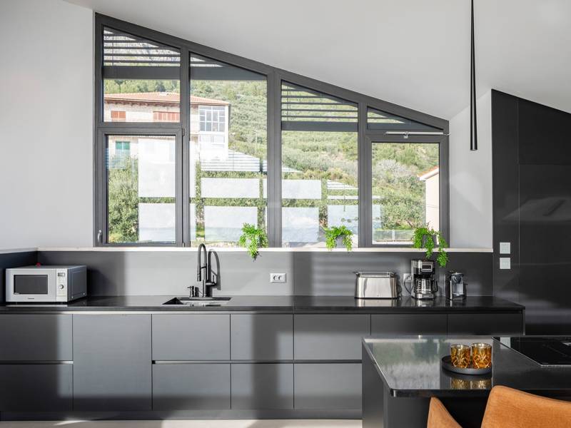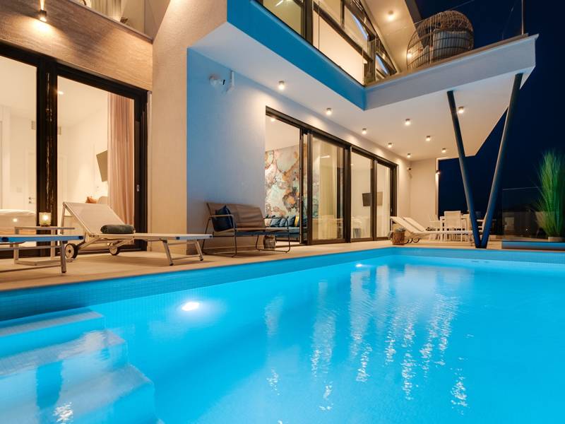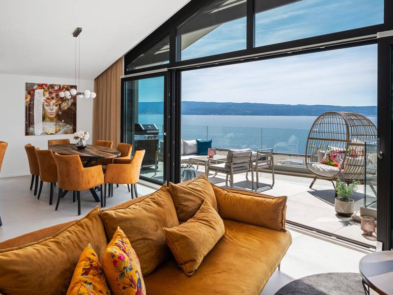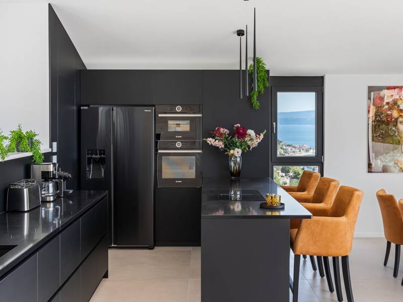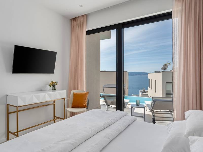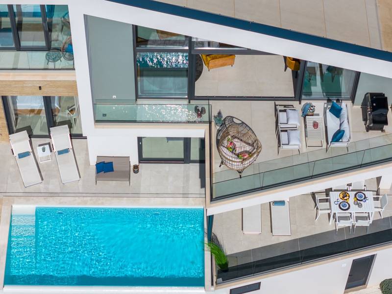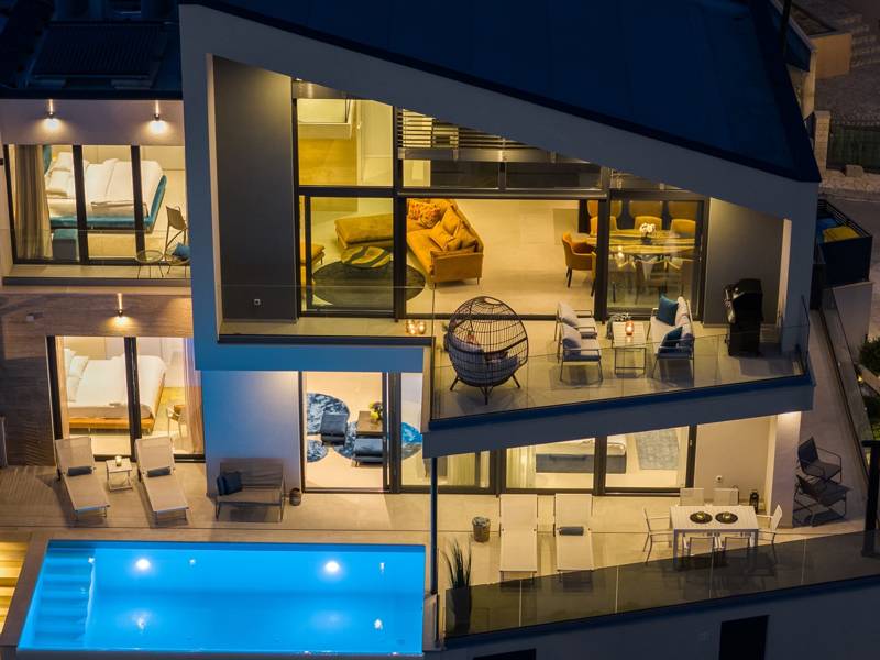 *De eerste verdieping verwelkomt je met een grote, elegant ontworpen woonkamer met modern meubilair en grote ramen die het betoverende uitzicht op de sprankelende zee omlijsten. De woonkamer, eethoek en volledig uitgeruste keuken zijn allemaal naadloos verbonden door een open lay-out die het de ideale plek maakt om gasten te ontvangen en tijd door te brengen met geliefden. Aan de voorkant van de woon/eetkamer is een terras met een zithoek, en er is ook een leeshoek op de galerij, net boven de woonkamer. Op de eerste verdieping is slaapkamer NO1, met een kingsize bed van 180 bij 200, tv, airconditioning en een eigen badkamer met een douche. *Twee slaapkamers met eigen badkamer en een extra woonruimte zijn beschikbaar op de begane grond. Met gezellige kingsize bedden van 180 bij 200, een chique inrichting, airconditioning, een tv en een eigen badkamer met een douche, bieden beide prachtig ingerichte slaapkamers een rustig toevluchtsoord voor rust en ontspanning. Deze twee slaapkamers hebben directe toegang tot het zwembad, dus word wakker met uitzicht op het zwembad. Tussendoor is er nog een woonkamer met een bank en een tv met een PlayStation5, daarnaast is er een apart toilet. *Buiten (begane grond) Er is een verwarmd privézwembad van 7 x 3 meter buiten met een elektrolyse systeem, evenals een zonneterras met 6 ligstoelen waar je kunt ontspannen in de zon, afkoelen in het zwembad, of buiten eten terwijl je naar de zonsondergang kijkt. Met zijn privézwembad en prachtig uitzicht op zee zal deze villa met drie slaapkamers al je verwachtingen overtreffen, of je nu op zoek bent naar een weelderig toevluchtsoord of een rustige ontsnapping. *Een fitnessruimte met airconditioning, een tv, een hometrainer, een roeimachine en een stepper is beschikbaar op de benedenverdieping. Er is een wasruimte met een wasmachine, droger en strijkbenodigdheden direct ernaast.