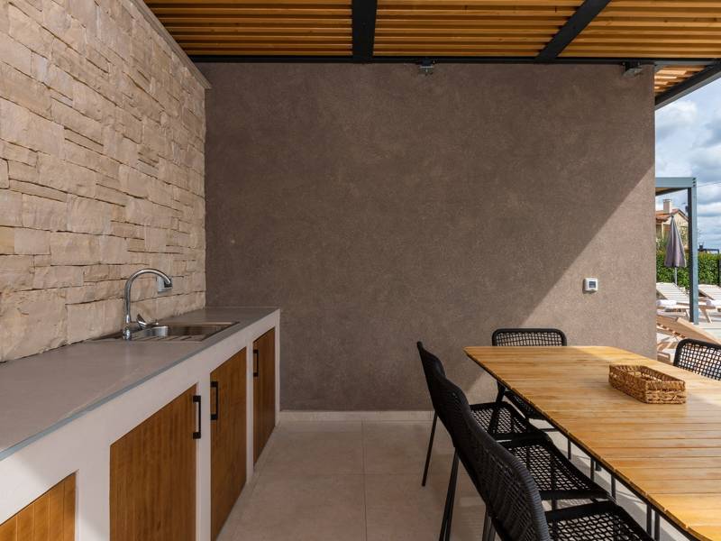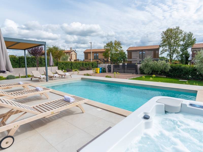 Trakteer jezelf op een droomvakantie in het gezelschap van je geliefden door te verblijven in de charmante Villa Albona in het rustige dorpje Kadumi, in de buurt van Poreč. Het is een perfecte keuze voor een gezin of een groep vrienden omdat het tot 6 personen kan herbergen. Deze volledig van airconditioning voorziene villa biedt alles wat je nodig hebt voor de perfecte vakantie. Er zijn drie prachtig ingerichte slaapkamers met eigen badkamer tot je beschikking. Het open ruimte concept van de hoofdverdieping biedt genoeg ruimte voor volledige ontspanning en plezier voor de hele groep. De moderne keuken is uitgerust met alles wat je nodig hebt om heerlijke maaltijden te bereiden, die je kunt serveren aan de ruime eettafel. De comfortabele woonkamer is perfect voor een middagpauze of gewoon om te ontspannen onder de airconditioning. Er staat ook een moderne sauna tot je beschikking in de villa. Grote schuifdeuren bieden ongehinderde toegang tot de binnenplaats van de villa, waar een ruim zwembad op je wacht met bijbehorende ligstoelen om de hele dag van de zon te genieten. Als je graag buiten aan je koffie nipt, dan is de binnenplaats perfect voor jou. Je vindt er een eettafel en een buitenkeuken om verleidelijke gerechten te bereiden op de grill bij zonsondergang. Er staat ook een jacuzzi tot je beschikking, als kers op de taart van dit prachtige huis.