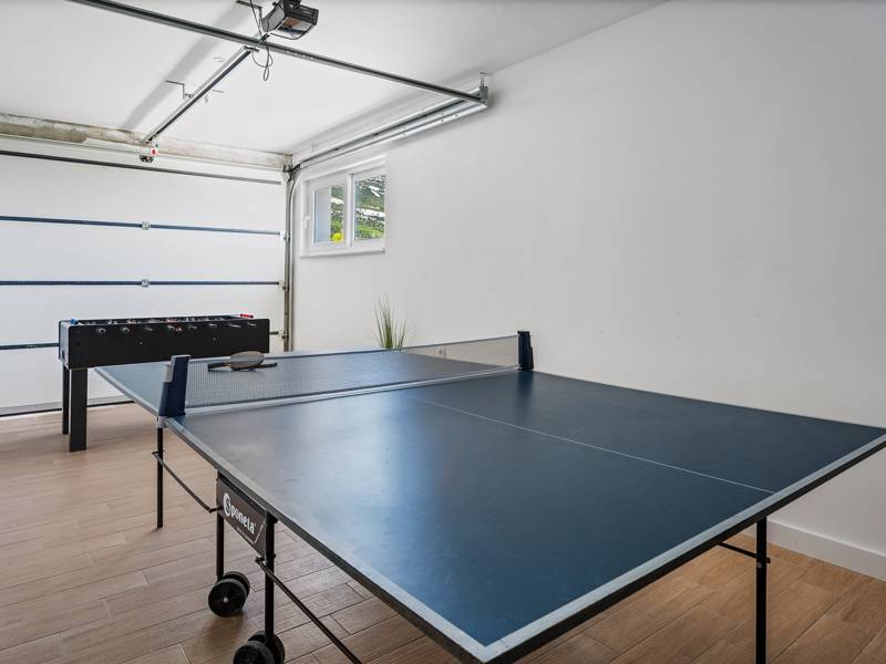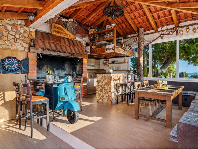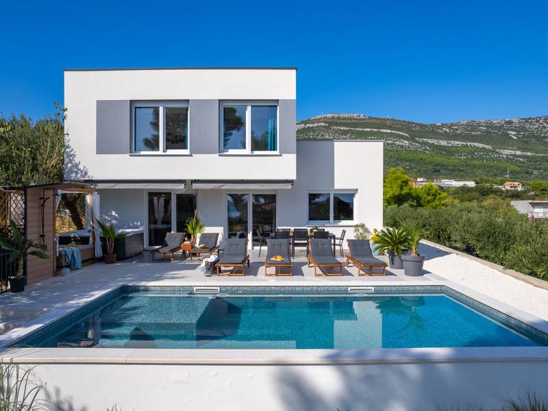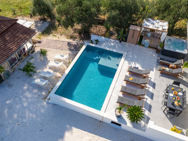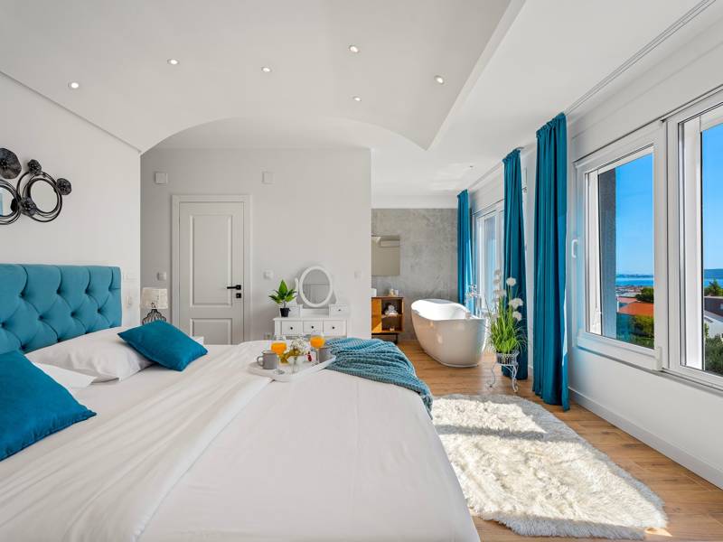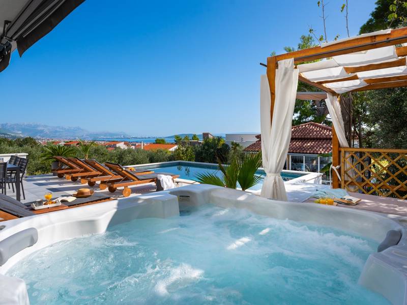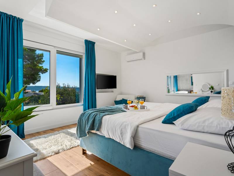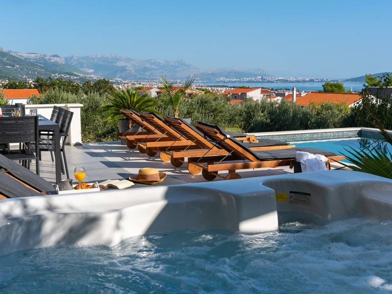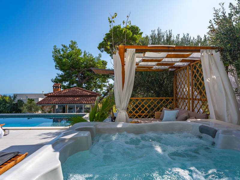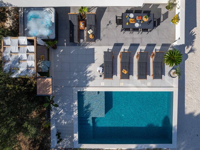 * De buitenruimte biedt exclusief voor jou een privézwembad van 8m x 5m en een jacuzzi (Hot-Tub) ernaast, 6 ligstoelen, een baldahin ligbed, een overdekte eethoek met een prachtig uitzicht op de omgeving en de zee, en een houten kinderhuisje met een glijbaan en een schommel. Een paar treden naar beneden brengt je naar een extra zonneterras met natuurlijke schaduw en 4 ligstoelen, een zomerkeuken met een barbecue (hout/kolen), een keuken (koelkast, vaatwasser, fornuis, een waterkoker), een loungehoek, darts voor wat plezier, een bar, een eettafel en een toilet. De begane grond biedt een volledig van airconditioning voorziene woonkamer (50 m²) met een volledig uitgeruste keuken (koelkast, magnetron, waterkoker, capsule koffiezetapparaat), tv, airco, gratis WiFi, PS4, uitgang naar het terras met uitzicht op het zwembad en de zee. Er is een slaapkamer nr. 1 (10,5m²) met een queensize bed van 160x200cm, tv, airco, en daarnaast is een familiebadkamer met een douche. In de garage staat een tafelvoetbalspel, een tafeltennistafel en er is wat extra speelgoed voor de allerkleinsten. * Op de eerste verdieping is een grote slaapkamer nr. 2 (26m²) met een super kingsize bed van 200x200cm, TV, airco, en-suite inloopdouche, een toilet en een vrijstaand bad.Slaapkamer No3 (13m²) met queensize bed 160x200cm, TV, A/C; Slaapkamer No4 (13m²) met queensize bed 160x200cm, TV, A/C; En er is een Familiebadkamer met een douche en een wasmachine. De volgende diensten zijn inbegrepen in de huurtarieven: -Bad- en zwembadhanddoeken, bedlinnen -Keuken en barbecue faciliteiten -Bedrijven -Water, gas, elektriciteit, verwarming, air-conditioning -Draadloos internet -Beveiligde parkeerplaats (6 parkeerplaatsen voor het huis) -Tuin en zwembad onderhoud -Eindschoonmaak -Toeristenbelasting, Sojourn tax - Huisdieren zijn NIET toegestaan. De straat is geasfalteerd voor de laatste 300 meter naar het huis.