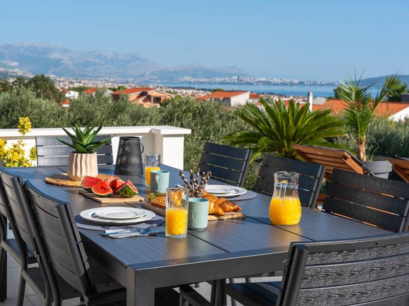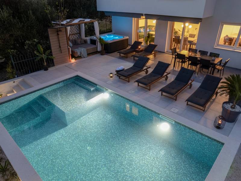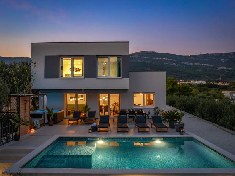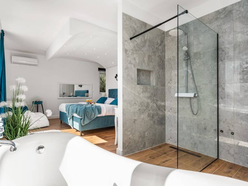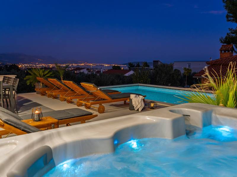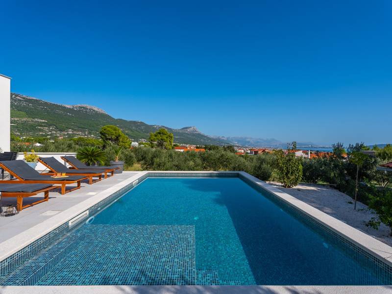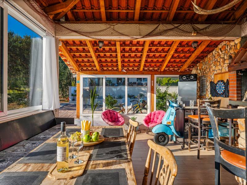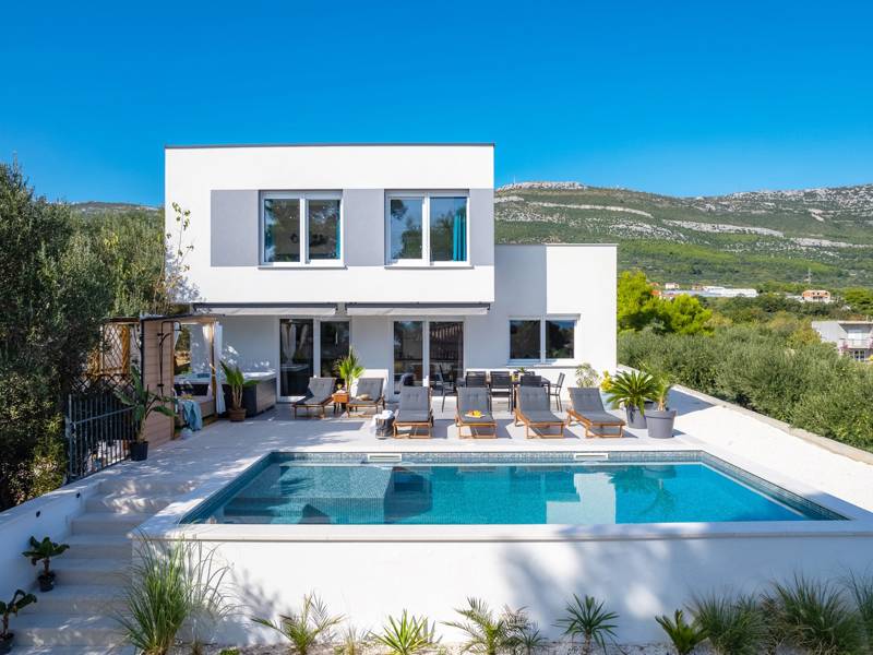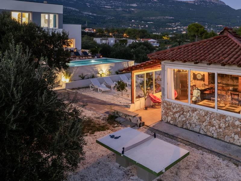 * De buitenruimte biedt exclusief voor jou een privézwembad van 8m x 5m en een jacuzzi (Hot-Tub) ernaast, 6 ligstoelen, een baldahin ligbed, een overdekte eethoek met een prachtig uitzicht op de omgeving en de zee, en een houten kinderhuisje met een glijbaan en een schommel. Een paar treden naar beneden brengt je naar een extra zonneterras met natuurlijke schaduw en 4 ligstoelen, een zomerkeuken met een barbecue (hout/kolen), een keuken (koelkast, vaatwasser, fornuis, een waterkoker), een loungehoek, darts voor wat plezier, een bar, een eettafel en een toilet. De begane grond biedt een volledig van airconditioning voorziene woonkamer (50 m²) met een volledig uitgeruste keuken (koelkast, magnetron, waterkoker, capsule koffiezetapparaat), tv, airco, gratis WiFi, PS4, uitgang naar het terras met uitzicht op het zwembad en de zee. Er is een slaapkamer nr. 1 (10,5m²) met een queensize bed van 160x200cm, tv, airco, en daarnaast is een familiebadkamer met een douche. In de garage staat een tafelvoetbalspel, een tafeltennistafel en er is wat extra speelgoed voor de allerkleinsten. * Op de eerste verdieping is een grote slaapkamer nr. 2 (26m²) met een super kingsize bed van 200x200cm, TV, airco, en-suite inloopdouche, een toilet en een vrijstaand bad.Slaapkamer No3 (13m²) met queensize bed 160x200cm, TV, A/C; Slaapkamer No4 (13m²) met queensize bed 160x200cm, TV, A/C; En er is een Familiebadkamer met een douche en een wasmachine. De volgende diensten zijn inbegrepen in de huurtarieven: -Bad- en zwembadhanddoeken, bedlinnen -Keuken en barbecue faciliteiten -Bedrijven -Water, gas, elektriciteit, verwarming, air-conditioning -Draadloos internet -Beveiligde parkeerplaats (6 parkeerplaatsen voor het huis) -Tuin en zwembad onderhoud -Eindschoonmaak -Toeristenbelasting, Sojourn tax - Huisdieren zijn NIET toegestaan. De straat is geasfalteerd voor de laatste 300 meter naar het huis.