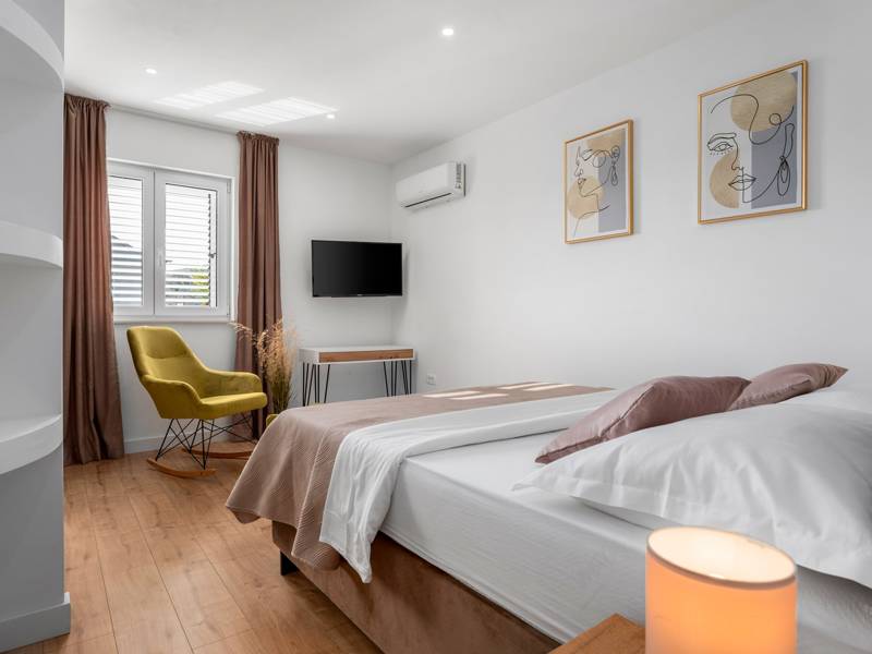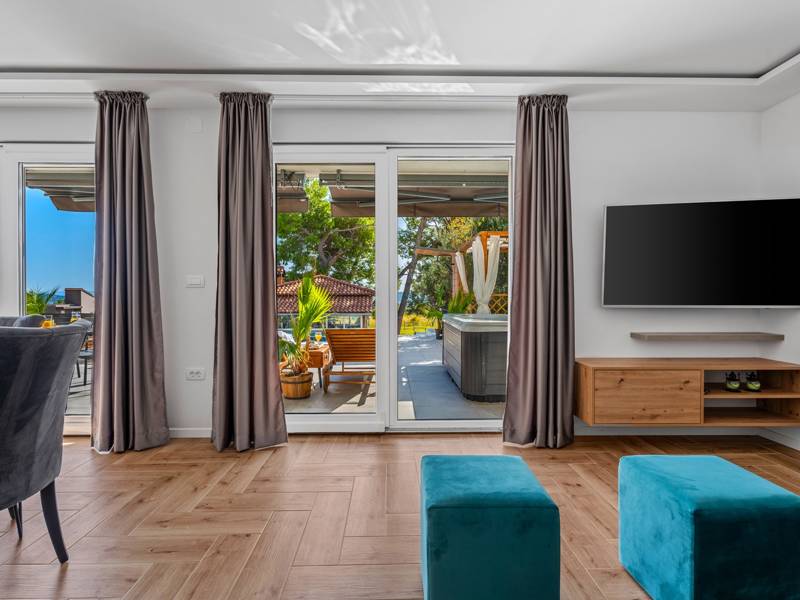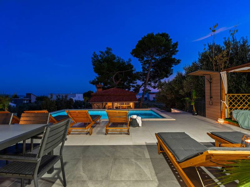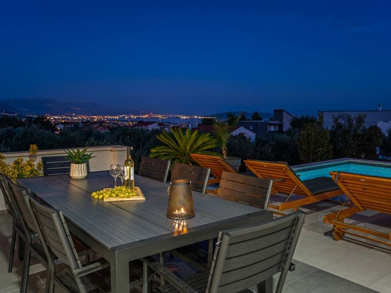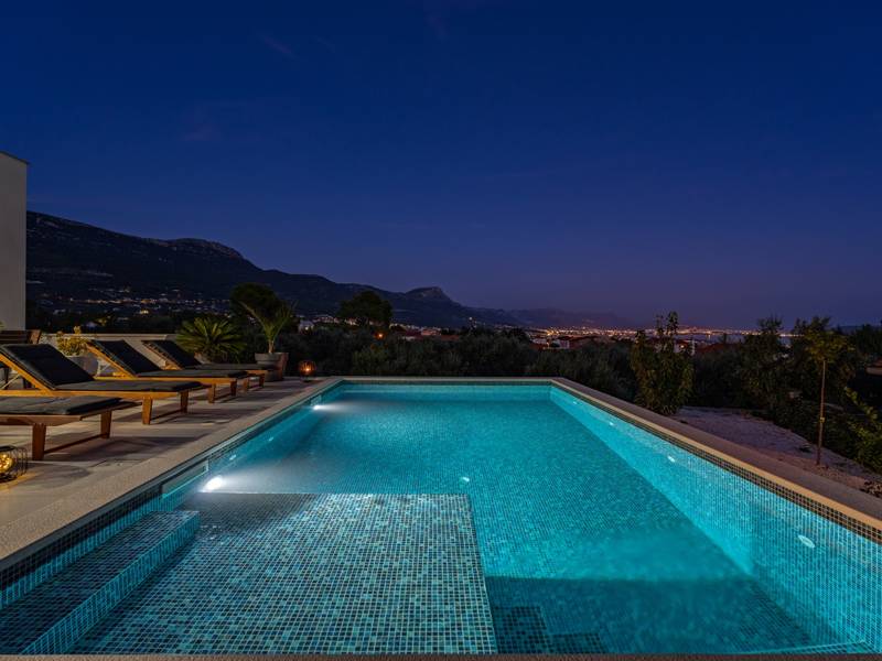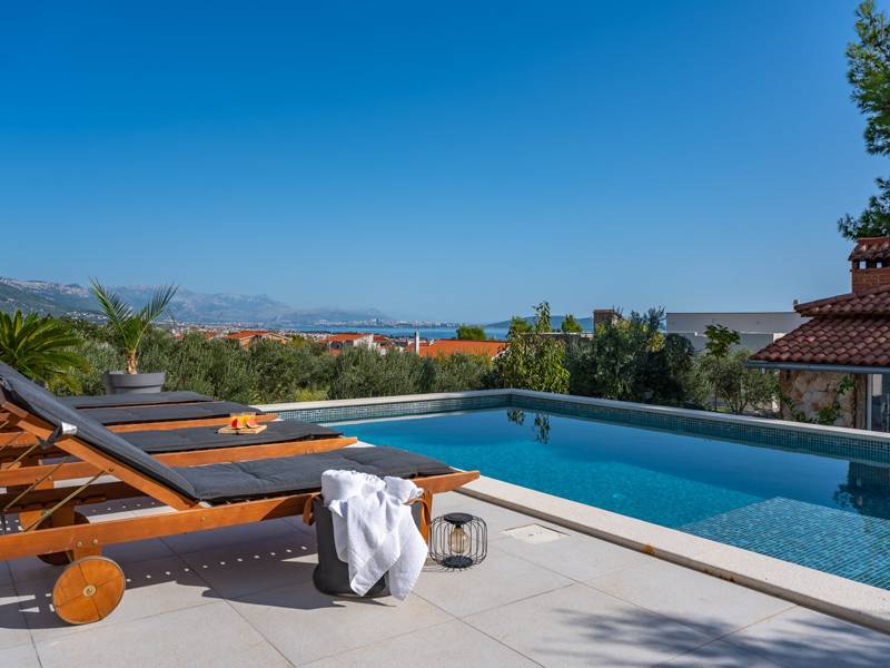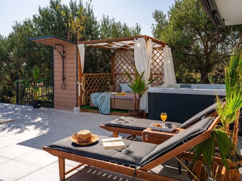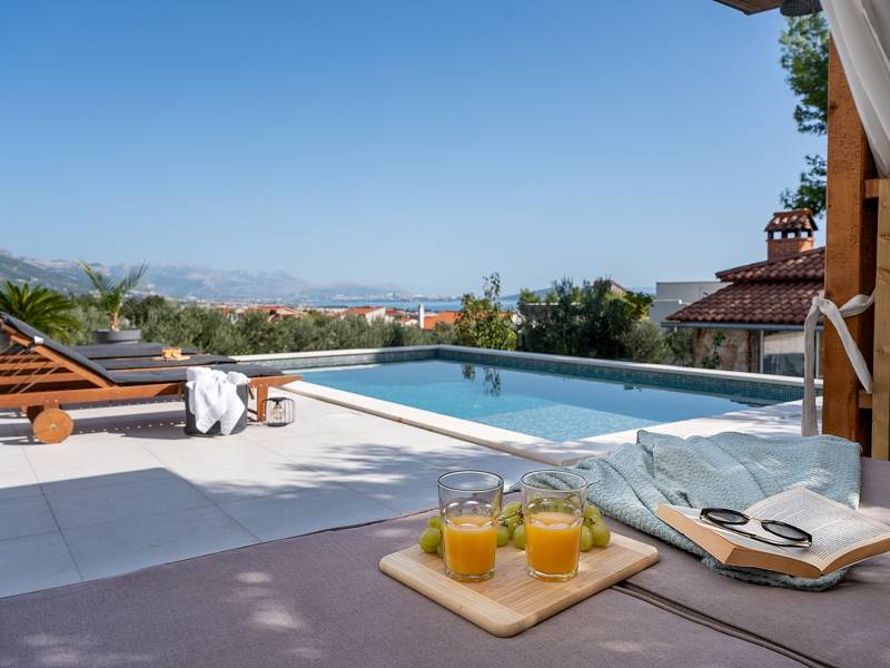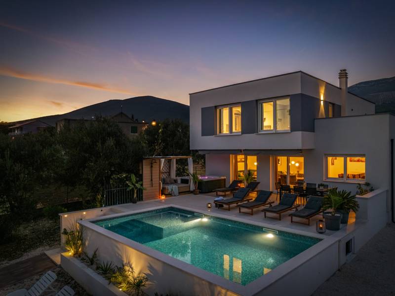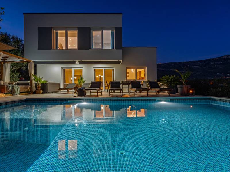 * De buitenruimte biedt exclusief voor jou een privézwembad van 8m x 5m en een jacuzzi (Hot-Tub) ernaast, 6 ligstoelen, een baldahin ligbed, een overdekte eethoek met een prachtig uitzicht op de omgeving en de zee, en een houten kinderhuisje met een glijbaan en een schommel. Een paar treden naar beneden brengt je naar een extra zonneterras met natuurlijke schaduw en 4 ligstoelen, een zomerkeuken met een barbecue (hout/kolen), een keuken (koelkast, vaatwasser, fornuis, een waterkoker), een loungehoek, darts voor wat plezier, een bar, een eettafel en een toilet. De begane grond biedt een volledig van airconditioning voorziene woonkamer (50 m²) met een volledig uitgeruste keuken (koelkast, magnetron, waterkoker, capsule koffiezetapparaat), tv, airco, gratis WiFi, PS4, uitgang naar het terras met uitzicht op het zwembad en de zee. Er is een slaapkamer nr. 1 (10,5m²) met een queensize bed van 160x200cm, tv, airco, en daarnaast is een familiebadkamer met een douche. In de garage staat een tafelvoetbalspel, een tafeltennistafel en er is wat extra speelgoed voor de allerkleinsten. * Op de eerste verdieping is een grote slaapkamer nr. 2 (26m²) met een super kingsize bed van 200x200cm, TV, airco, en-suite inloopdouche, een toilet en een vrijstaand bad.Slaapkamer No3 (13m²) met queensize bed 160x200cm, TV, A/C; Slaapkamer No4 (13m²) met queensize bed 160x200cm, TV, A/C; En er is een Familiebadkamer met een douche en een wasmachine. De volgende diensten zijn inbegrepen in de huurtarieven: -Bad- en zwembadhanddoeken, bedlinnen -Keuken en barbecue faciliteiten -Bedrijven -Water, gas, elektriciteit, verwarming, air-conditioning -Draadloos internet -Beveiligde parkeerplaats (6 parkeerplaatsen voor het huis) -Tuin en zwembad onderhoud -Eindschoonmaak -Toeristenbelasting, Sojourn tax - Huisdieren zijn NIET toegestaan. De straat is geasfalteerd voor de laatste 300 meter naar het huis.