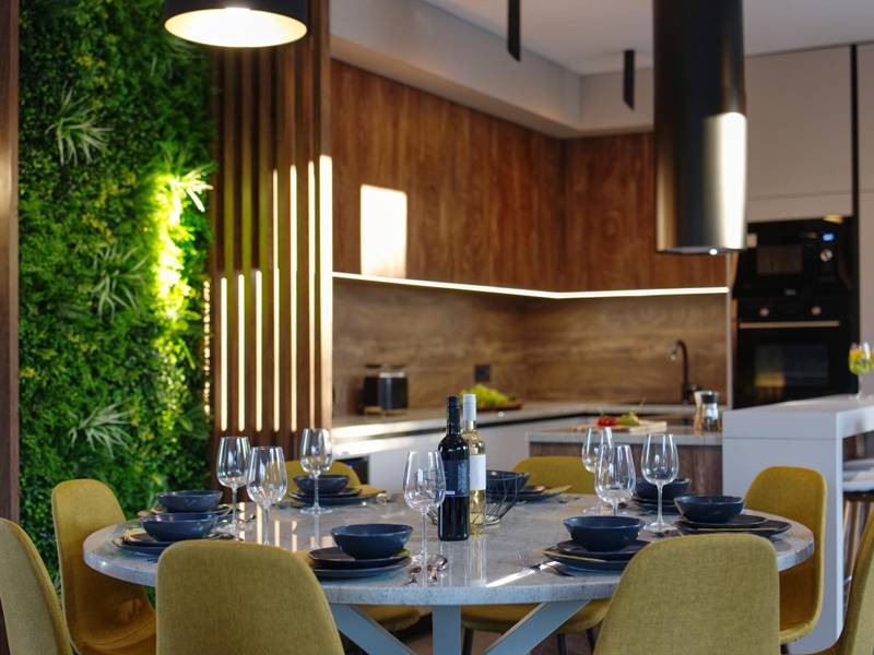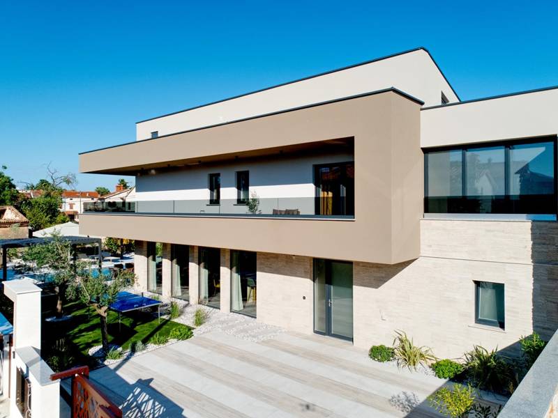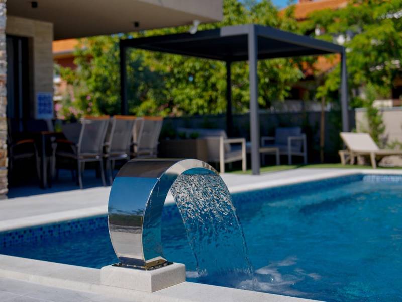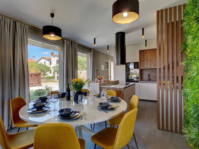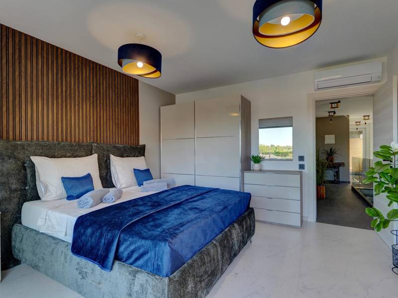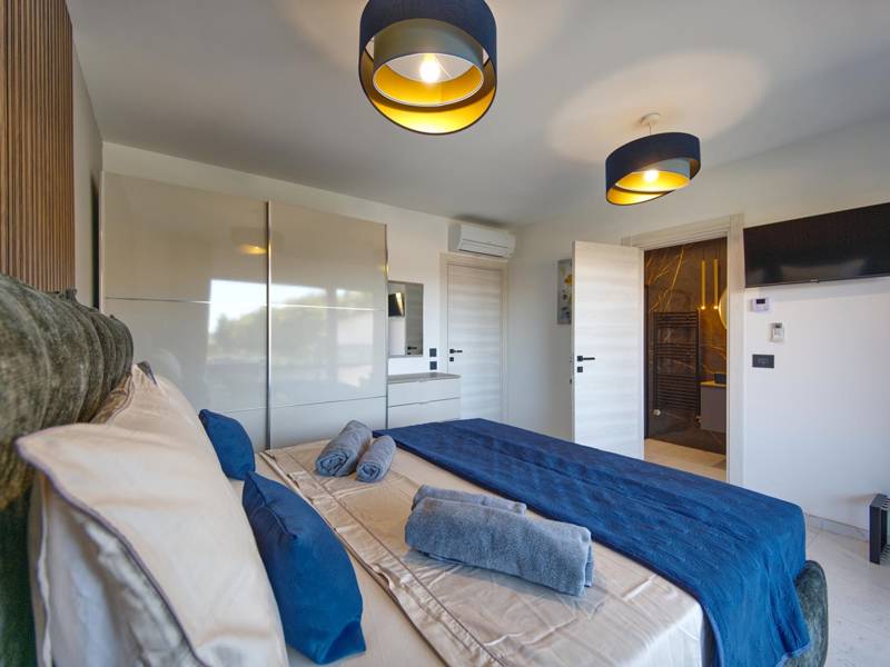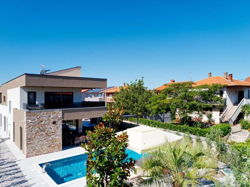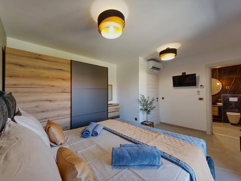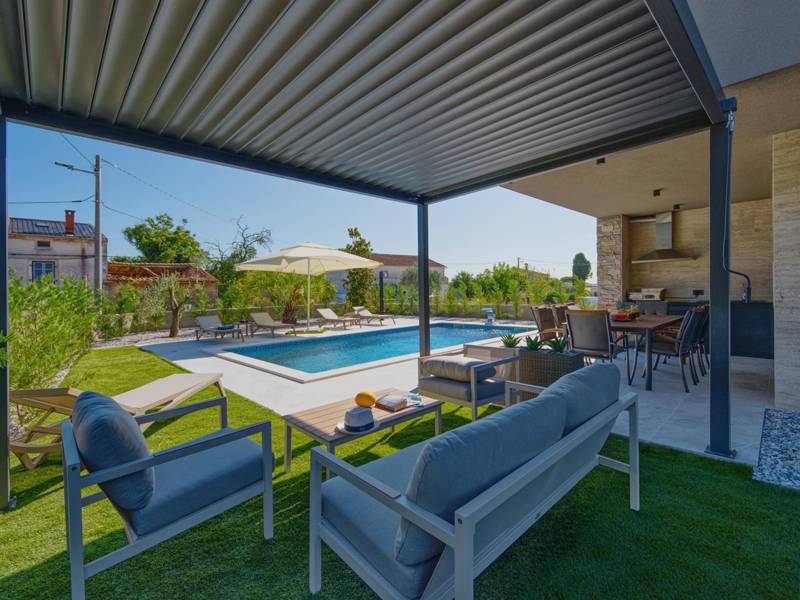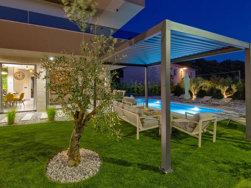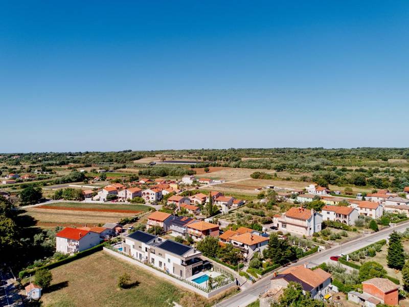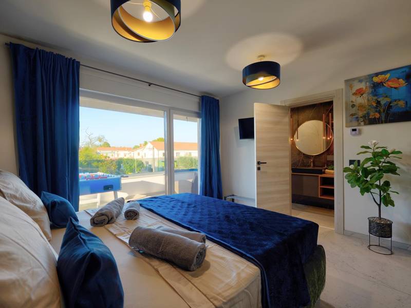 Deze twee moderne villa's, Villa Bavigo en Villa Pieron, gelegen in de buurt van Pula, zijn perfect voor een privé en comfortabele vakantie. Alleen verbonden door de achterwand, kunnen ze individueel of samen gehuurd worden, waardoor ze ideaal zijn voor grotere families of groepen vrienden. Beide villa's bieden luxe accommodatie met vier slaapkamers, vier badkamers, een ruime woonkamer en een volledig uitgeruste keuken. De buitenruimte beschikt over een privézwembad met een waterval, een gezellige eethoek, een barbecue en een zomerkeuken. Voor extra vermaak zijn er tafeltennis en tafelvoetbal. Op de eerste verdieping van elke villa is er een woonkamer met toegang tot het terras, een slaapkamer met een tweepersoonsbed en een badkamer, terwijl de tweede verdieping nog eens drie slaapkamers bevat, elk met een eigen badkamer en toegang tot het terras. De wellnessruimte met bubbelbad en sauna bevindt zich ook op deze verdieping, zodat je volledig kunt ontspannen tijdens je verblijf. Elke villa is voorzien van airconditioning en geschikt voor maximaal acht personen, terwijl beide villa's samen geschikt zijn voor maximaal 16 gasten. De tuin heeft een privézwembad, ligstoelen, parasols en een overdekt terras, perfect voor avondbijeenkomsten en barbecues. De omheinde tuin zorgt voor volledige privacy en er zijn twee privéparkeerplaatsen per villa beschikbaar. Boek een of beide villa's en verzeker jezelf van een onvergetelijke vakantie in het prachtige Istrië. Let op: Huisdieren en jeugdgroepen zijn alleen op aanvraag toegestaan.