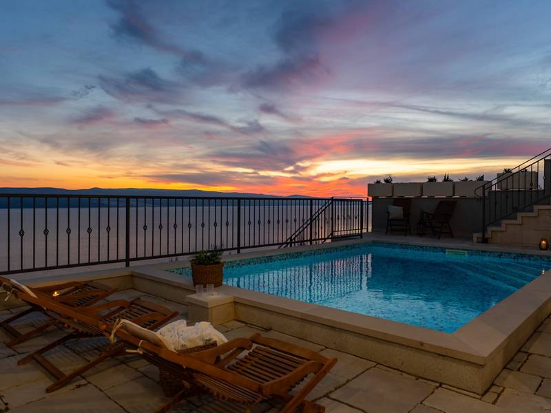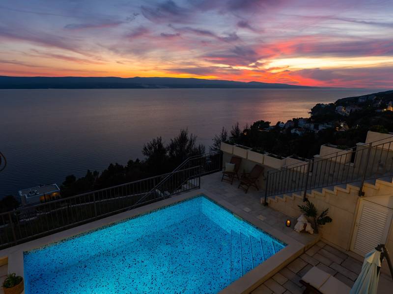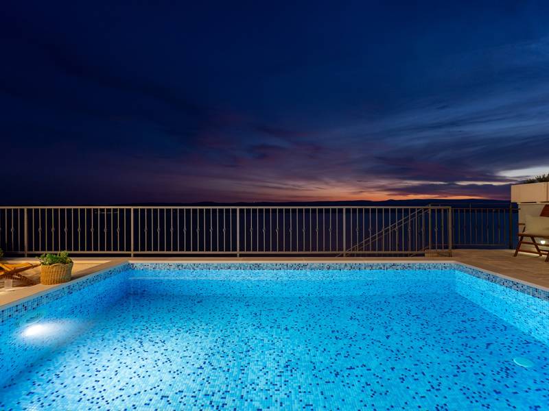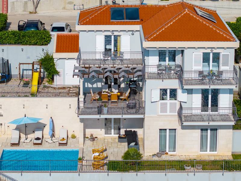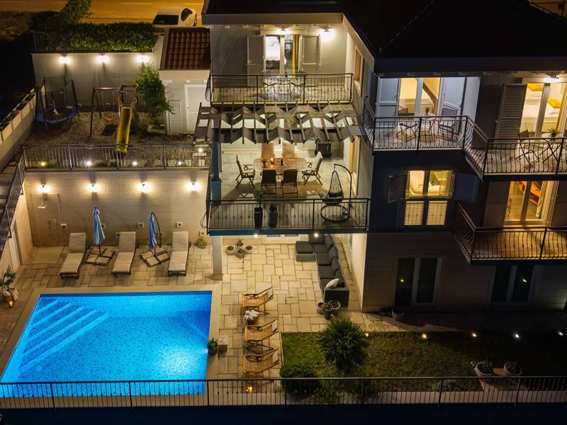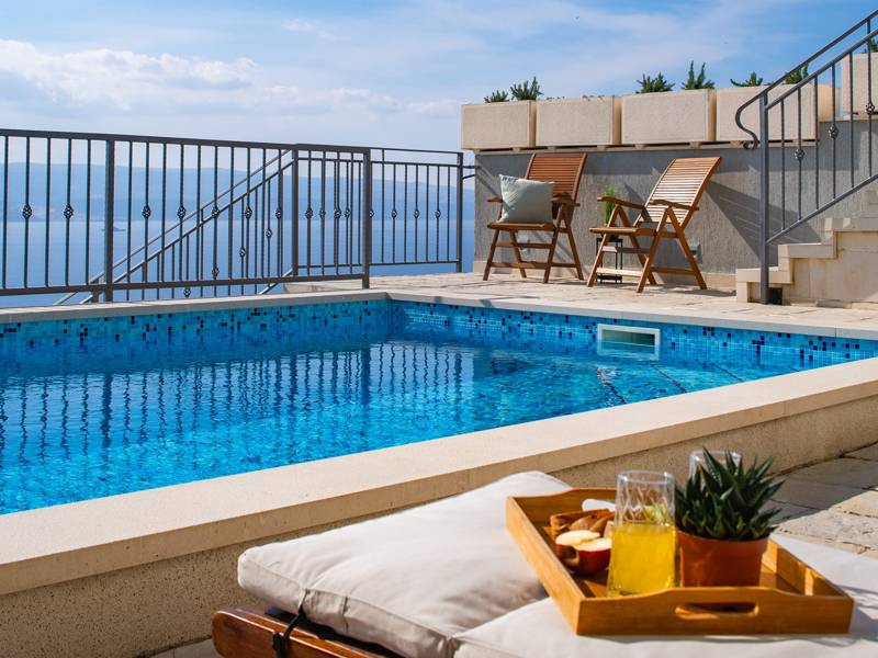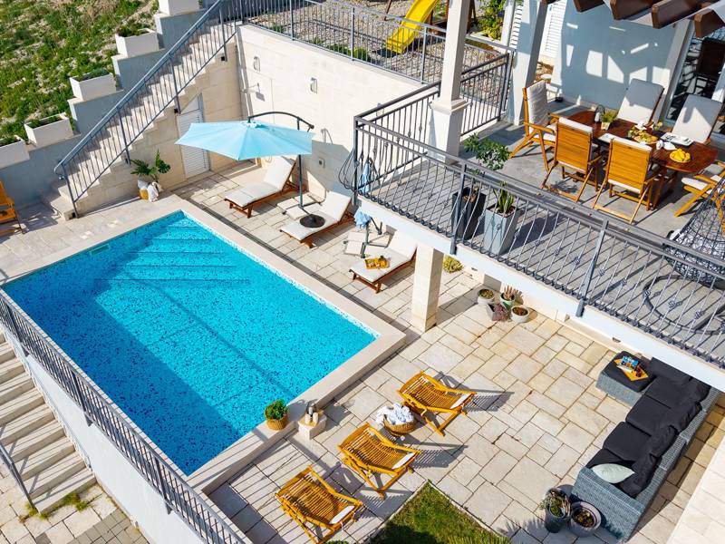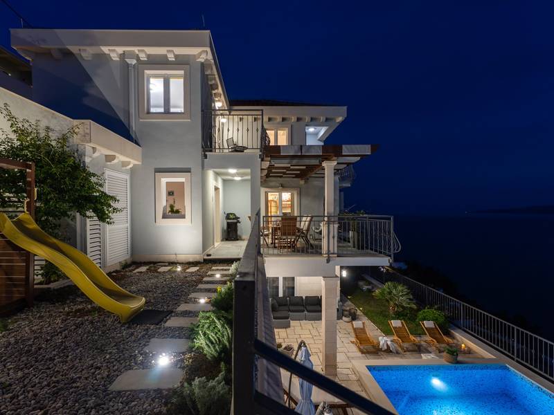 **Villa S&A** - Een comfortabel toevluchtsoord met verwarmd privézwembad Ontdek Villa S&A, een ideale accommodatie voor maximaal 6 gasten, met een verwarmd privézwembad en een adembenemend panoramisch uitzicht op het kristalheldere turquoise water van de Adriatische Zee en het eiland Brač. Deze villa garandeert uw privacy en is gelegen in een rustige en stille omgeving, waardoor u kunt genieten van een ontspannen verblijf. Het pand ligt op een helling en bestaat uit meerdere niveaus, met een totale oppervlakte van 500 m², waarbij de villa zelf 200 m² beslaat. Een auto wordt aanbevolen en er zijn twee parkeerplaatsen gereserveerd voor jouw gemak. De villa is volledig voorzien van airconditioning en biedt gratis WiFi. **Villa Indeling:** *Eerste niveau:* - De hoofdingang leidt naar het slaapgedeelte, dat bestaat uit: - **Slaapkamer 1**: Hoofdslaapkamer met een kingsize bed (180cm x 200cm), een balkon met open zeezicht, een en-suite badkamer met een douche, airconditioning en een tv. - **Slaapkamer 2**: Queensize bed (160cm x 200cm), een balkon met vrij uitzicht op zee, airconditioning en een tv. - **Slaapkamer 3**: Twee eenpersoonsbedden (90cm x 200cm), een balkon met vrij uitzicht op zee, airconditioning en een tv. - Een familiebadkamer met douche is beschikbaar voor slaapkamers 2 en 3. Elke badkamer is uitgerust met toiletartikelen. Elke badkamer is voorzien van toiletartikelen, waaronder shampoo, conditioner, douchegel, badjassen, slippers en haardrogers. *Lager niveau:* - Een interne trap leidt naar de ruime, open woonkamer, die een prachtig uitzicht op zee biedt en in verbinding staat met de eetruimte buiten. De woonkamer is voorzien van comfortabele banken, een tv, airconditioning en een volledig uitgeruste keuken met een eethoek voor 8 personen, plus een gezellige open haard. De keuken is voorzien van moderne apparatuur, waaronder een DeLonghi espressomachine, een blender, een magnetron en een waterkoker. Daarnaast is er een familiebadkamer met een douche en een wasmachine. *Buitenruimte:* - De eethoek buiten is handig verbonden met de keuken en woonkamer, met een overdekte ruimte met een gasbarbecue en een prachtig uitzicht op zee en het eiland om van te genieten op elk moment van de dag of nacht. Aangrenzend is een speelplaats voor kinderen, compleet met een trampoline, een houten speelhuisje met een glijbaan en een schommel. Bij het huis horen ook 3 mountainbikes die je kunt gebruiken. *Zwembadgedeelte:* - Daal de buitentrap af naar het zwembadgedeelte, met een verwarmd privézwembad van 25 m² met een tegenstroomprogramma voor absolute privacy. Hier vind je 6 ligstoelen en een loungehoek, perfect om te ontspannen met een glas wijn en een goed boek terwijl je geniet van het spectaculaire uitzicht. Villa S&A is een uniek en ruim toevluchtsoord, goed uitgerust voor jouw comfort en beheerd door vriendelijke eigenaren die je graag informatie geven over lokale attracties en activiteiten. Deze villa is echt een perfecte locatie voor jouw ideale vakantie. Welkom in Villa S&A in Mimice!