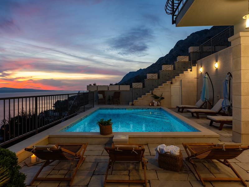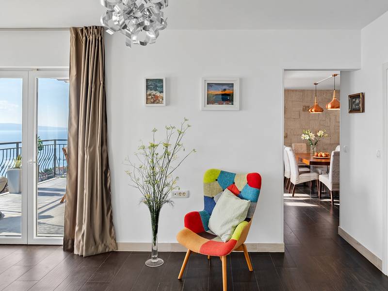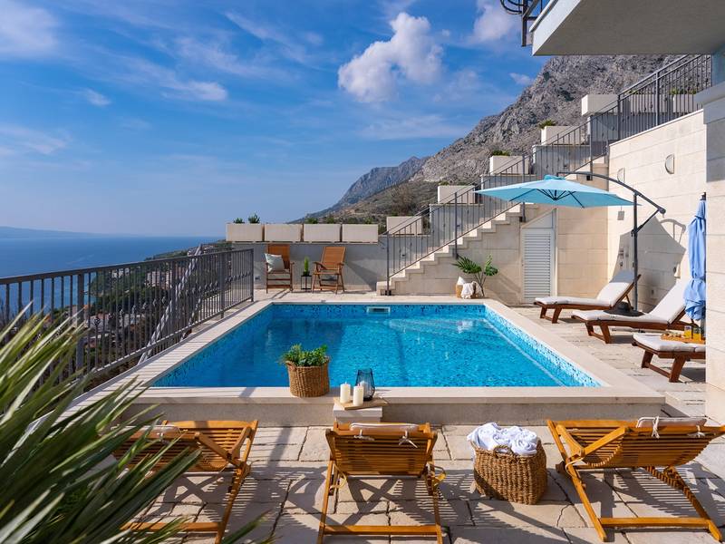 **Villa S&A** - een comfortabel toevluchtsoord met verwarmd privézwembad Ontdek Villa S&A, een ideale accommodatie voor maximaal 6 gasten, met een verwarmd privézwembad en een adembenemend panoramisch uitzicht op het kristalheldere turquoise water van de Adriatische Zee en het eiland Brač. Deze villa garandeert uw privacy en is gelegen in een rustige en stille omgeving, waardoor u verzekerd bent van een ontspannen verblijf. De woning ligt op een helling en bestaat uit meerdere verdiepingen met een totale oppervlakte van 500 m², waarvan de villa zelf 200 m² beslaat. Een auto wordt aanbevolen en er zijn twee parkeerplaatsen gereserveerd voor jouw gemak. De villa is volledig voorzien van airconditioning en biedt gratis WiFi. **Villa Indeling:** *Eerste niveau:* - De hoofdingang leidt naar het slaapgedeelte, dat bestaat uit: - Slaapkamer 1**: Grote slaapkamer met een kingsize bed (180cm x 200cm), een balkon met vrij uitzicht op zee, een en-suite badkamer met een douche, airconditioning en een tv. - **Slaapkamer 2**: Queensize bed (160cm x 200cm), een balkon met vrij uitzicht op zee, airconditioning en een tv. - Slaapkamer 3**: Twee eenpersoonsbedden (90cm x 200cm), een balkon met vrij uitzicht op zee, airconditioning en een tv. - Een familiebadkamer met douche is beschikbaar voor slaapkamers 2 en 3. Elke badkamer is voorzien van toiletartikelen, waaronder shampoo, conditioner, douchegel, badjassen, slippers en haardrogers. *Benedenverdieping:* - Een interne trap leidt naar de ruime, open woonkamer, die een prachtig uitzicht op zee biedt en in verbinding staat met de eethoek buiten. De woonkamer is voorzien van comfortabele banken, een tv, airconditioning en een volledig uitgeruste keuken met een eethoek voor 8 personen, plus een gezellige open haard. De keuken is voorzien van moderne apparatuur, waaronder een DeLonghi espressomachine, een blender, een magnetron en een waterkoker. Daarnaast is er een familiebadkamer met een douche en een wasmachine. *Buitenruimte:* - De eethoek buiten is handig verbonden met de keuken en woonkamer, met een overdekte ruimte met een gasbarbecue en een prachtig uitzicht op zee en het eiland om van te genieten op elk moment van de dag of nacht. Aangrenzend is een speelplaats voor kinderen, compleet met een trampoline, een houten speelhuisje met een glijbaan en een schommel. Bij het huis horen ook 3 mountainbikes die je kunt gebruiken. *Zwembadgedeelte:* - Daal de buitentrap af naar het zwembadgedeelte, met een verwarmd privézwembad van 25 m² met een tegenstroomprogramma voor absolute privacy. Hier vind je 6 ligstoelen en een loungehoek, perfect om te ontspannen met een glas wijn en een goed boek terwijl je geniet van het spectaculaire uitzicht. Villa S&A is een uniek en ruim toevluchtsoord, goed uitgerust voor uw comfort en beheerd door vriendelijke eigenaren die u graag informatie geven over lokale attracties en activiteiten. Deze villa is echt een perfecte locatie voor jouw ideale vakantie. Welkom in Villa S&A in Mimice!