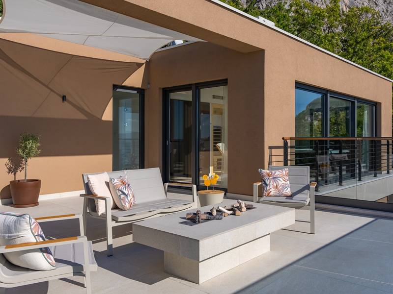 Het interieur is volledig voorzien van airconditioning en biedt gratis WiFi, en hier is een gedetailleerde plattegrond: * De Outdoor biedt een eigen en verwarmd, overloopzwembad 10m x 4,5m met een hydromassage. met een chloorvrij watersysteem dat zacht is en veel gezonder voor je lichaam, een ruim zonneterras dat niet over het hoofd wordt gezien met 8 ligstoelen, een zithoek, een overdekte eethoek buiten met een barbecue (elektrisch), en een buitendouche. Het zwembad met sfeervolle nachtverlichting zorgt voor een rustgevende achtergrond terwijl je geniet van het uitzicht op de stad Omiš eronder. Achter het huis is er een omheinde speeltuin met tafeltennis, badminton en een voetbalnet voor kinderen, zodat je jongere leden zich buiten kunnen vermaken. * Het dak (2e verdieping) biedt een overdekte wellnessruimte met een infraroodsauna, een whirlpool (hot tub), een douche, een tv en een kleine kitchenette. Een glazen raam van vloer tot plafond zorgt voor daglicht en een adembenemend uitzicht op de stad Omiš, de zee en het fort Peovica boven op de heuvel. Aan de oostkant is er een terras met een outdoor loopband, fitnessmatten en gewichten, zodat je de dag actief kunt beginnen, kijkend naar de zonsopgang terwijl je alleen de vogels hoort. De begane grond (zwembadniveau) biedt een volledig uitgeruste keuken met eersteklas apparatuur, een ruime woonkamer met een comfortabele bank, een flatscreen tv, een surround systeem en een glazen deur naar het zwembad. Er is ook een mediaruimte (18 m²) met sofa's, een flatscreen tv, een PlayStation 5 en airconditioning. Er is ook een apart toilet op de begane grond. * De eerste verdieping biedt een slaapgedeelte met 4 slaapkamers, elk met uitzicht op zee en het zwembad. Slaapkamer No1 (28 m²) super king size bed 200cm x200cm, en-suite badkamer met een douche, een minibar, A/C, een TV, en een terras met buitenmeubilair. Slaapkamer NO2 (22 m²) met super kingsize bed 200cm x 200cm, en-suite badkamer met een douche, een minibar, airco, een tv en een balkon. Slaapkamer NO3 (22 m²) met kingsize bed van 180 x 200 cm, eigen badkamer met douche, minibar, airco, tv en een balkon. Slaapkamer NO4 (28 m²) met super kingsize bed 200cm x 200cm, en-suite badkamer met een douche, een minibar, airco, een tv en een balkon. In navolging van het luxe gevoel dat dit geweldige pand geeft, zal elke gast worden voorzien van L`Occitane huidverzorgingsproducten samen met een badjas en slippers voor uw gebruik tijdens uw verblijf. Er is ook een wasserij met een wasmachine en een droger op de eerste verdieping. Er is een beveiligde privéparkeerplaats voor meer dan 4 auto's, met videobewaking.