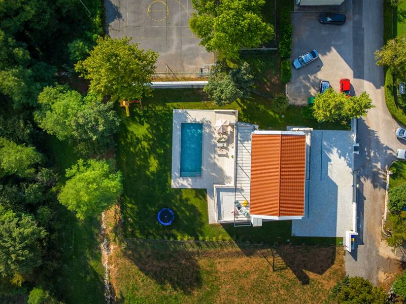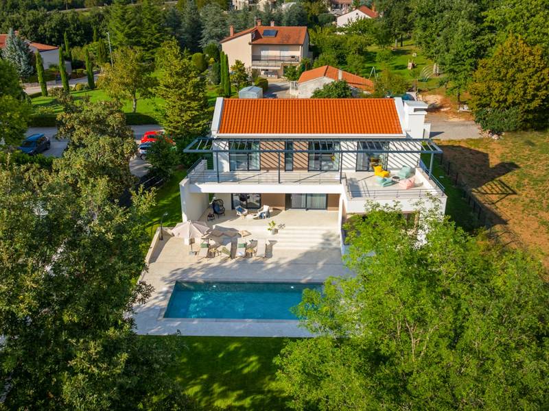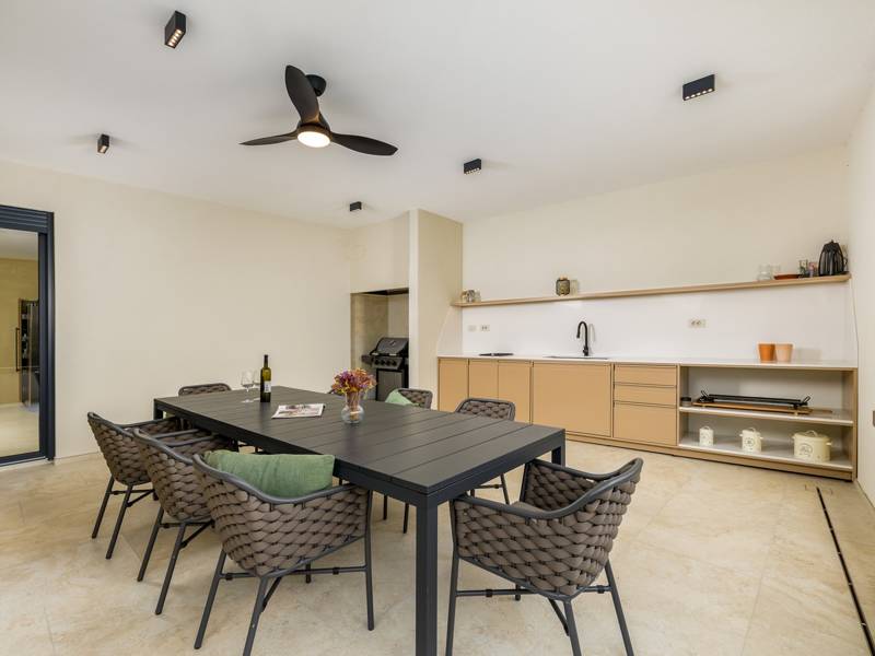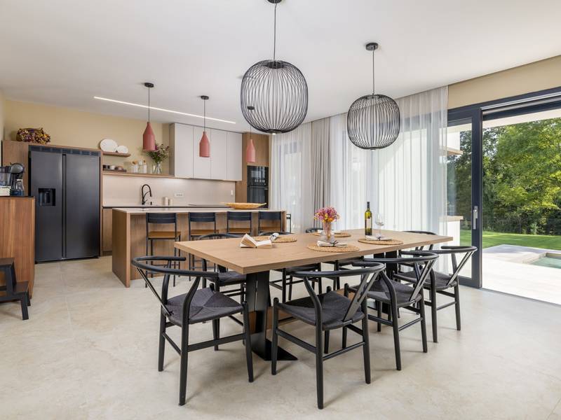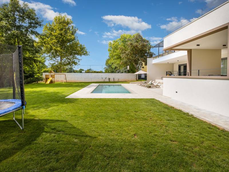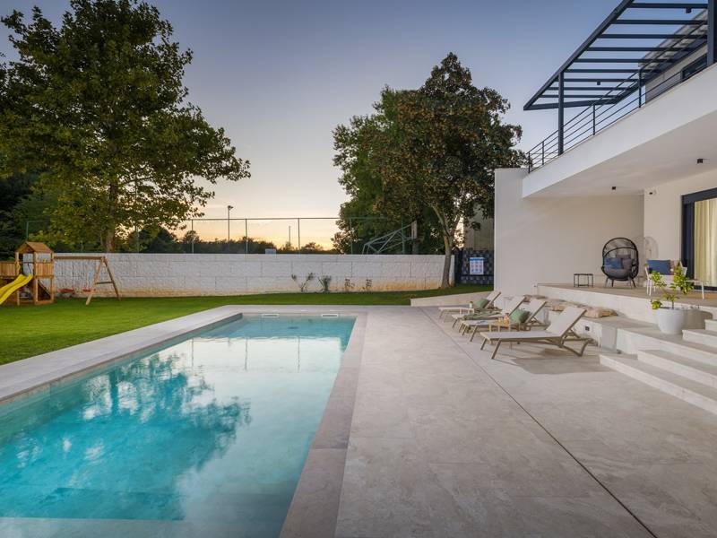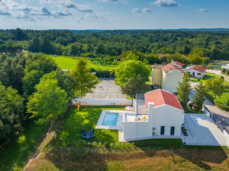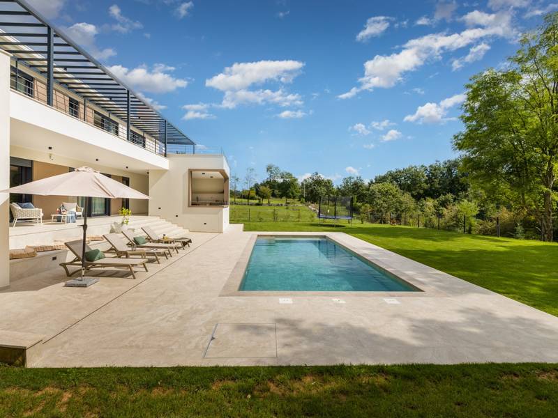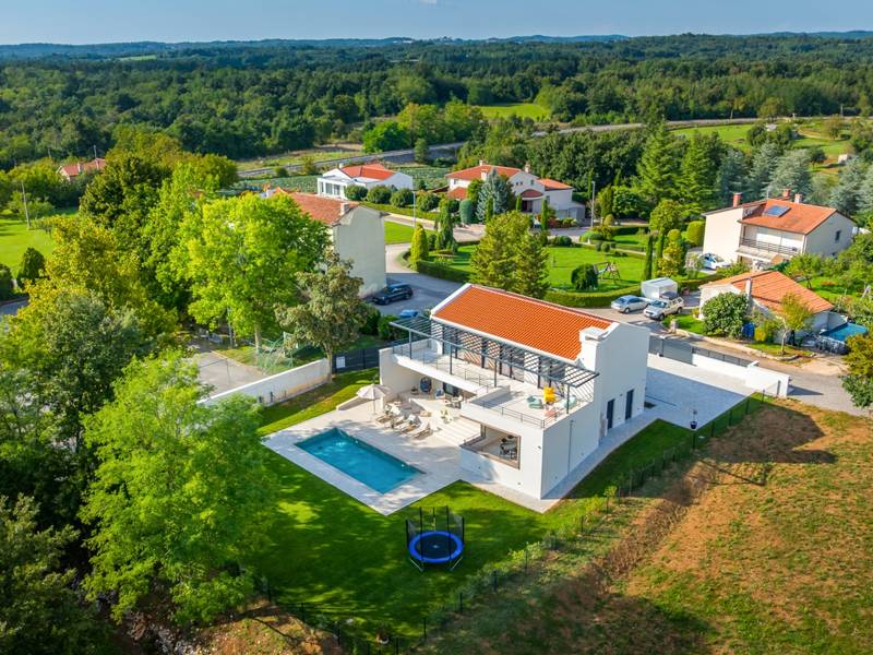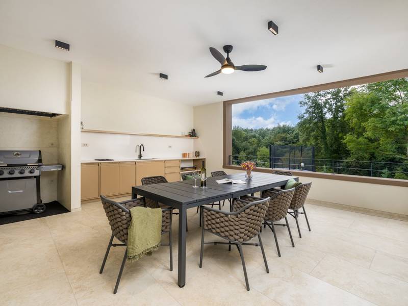 Ontsnap naar Villa Castanea, een stijlvol toevluchtsoord gelegen in het rustige dorpje Heki in het hart van Istrië. Deze prachtig ontworpen villa met 3 slaapkamers biedt 240 vierkante meter doordachte leefruimte op een volledig omheind privéperceel van 1.340 vierkante meter, waardoor het een ideale schuilplaats is voor gezinnen of groepen vrienden die op zoek zijn naar zowel comfort als rust. De villa biedt plaats aan maximaal zes gasten in drie elegante slaapkamers met eigen badkamer. Elke kamer heeft een flatscreentelevisie, airconditioning en toegang tot een balkon met uitzicht op het zwembad en het omliggende platteland. Twee slaapkamers hebben bedden van 100 x 210 cm die gecombineerd zijn tot een groot tweepersoonsbed, terwijl de derde slaapkamer een ruim tweepersoonsbed van 180 x 210 cm heeft. Alle kamers hebben een eigen badkamer met douche, waardoor gasten zowel privacy als comfort hebben. Binnen nodigen de open woon- en eetruimte uit tot ontspanning met gezellige banken, een flatscreentelevisie en veel natuurlijk licht. Grote ramen van vloer tot plafond bieden directe toegang tot het terras en een prachtig uitzicht op het zwembad, waardoor een naadloze verbinding ontstaat tussen binnen- en buitenruimtes. De volledig uitgeruste keuken heeft een stijlvol eiland, een koelkast, ijsmachine, een KRUPS espressomachine, filterkoffiezetapparaat, magnetron, waterkoker en alles wat je nodig hebt om heerlijke maaltijden te bereiden. De aangrenzende eethoek is perfect om te genieten van een gezamenlijk ontbijt of een romantisch diner. Extra voorzieningen zijn een gastentoilet op de begane grond, een wasmachine, droger en strijkbenodigdheden. De hele villa is volledig voorzien van airconditioning en high-speed WiFi. Stap naar buiten naar je eigen privéoase. Het zwembad van 10 x 4 meter is perfect om af te koelen tijdens warme middagen, terwijl zes comfortabele ligbedden op het zonneterras een ontspannen plek bieden om te ontspannen met een boek of te genieten van de zon. Een overdekte eethoek buiten biedt plaats aan maximaal tien personen, ideaal voor lange maaltijden in de buitenlucht. De barbecueplaats, uitgerust met een gas- of elektrische grill, maakt heerlijk koken onder de sterren mogelijk. Een buitendouche draagt bij aan het comfort en gemak. Er is privéparkeergelegenheid voor maximaal vier auto's, waardoor de toegang eenvoudig en stressvrij is. Villa Castanea ligt op slechts 150 meter van het plaatselijke treinstation, waardoor je zonder auto naar de stad Pula kunt reizen. In het huis is een treintabel aanwezig voor je gemak. Met deze optie kunnen gasten verkeersopstoppingen en parkeerproblemen in de stad vermijden terwijl ze genieten van een ontspannen rit. Villa Castanea is perfect gelegen om de schoonheid van Istrië te ontdekken. De nabijgelegen stad Pazin, op slechts tien minuten rijden, biedt attracties zoals het middeleeuwse kasteel van Pazin en de beroemde grot van Pazin met een spannende zipline. Wijnliefhebbers en fijnproevers kunnen in de omgeving genieten van proeverijen van lokale wijnen, olijfolie en Istrische truffels. De pittoreske kustplaatsjes Rovinj en Poreč, met hun stranden en historische charme, liggen op minder dan 40 minuten rijden. Je kunt ook iconische bezienswaardigheden verkennen zoals de Romeinse Arena in Pula, de Eufrasiusbasiliek in Poreč en de kerk van St. Eufemia in Rovinj. Charmante heuvelstadjes zoals Motovun, Grožnjan en Hum - het kleinste stadje ter wereld - zijn gemakkelijk te bereiken voor dagtripjes, terwijl het Nationaal Park Brijuni een mix van natuur en geschiedenis biedt. Of je je dagen nu liever luierend bij het zwembad doorbrengt, verborgen dorpjes ontdekt of geniet van de keuken van wereldklasse in Istrië, Villa Castanea biedt de perfecte omgeving voor een onvergetelijke vakantie-ervaring.