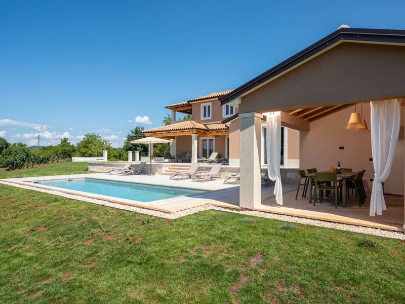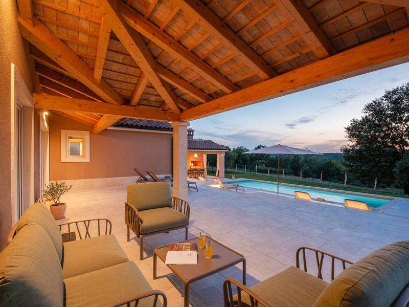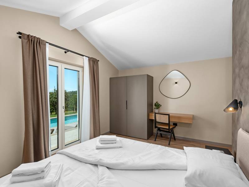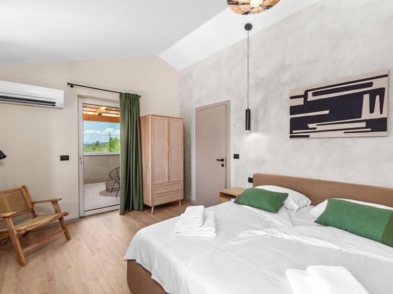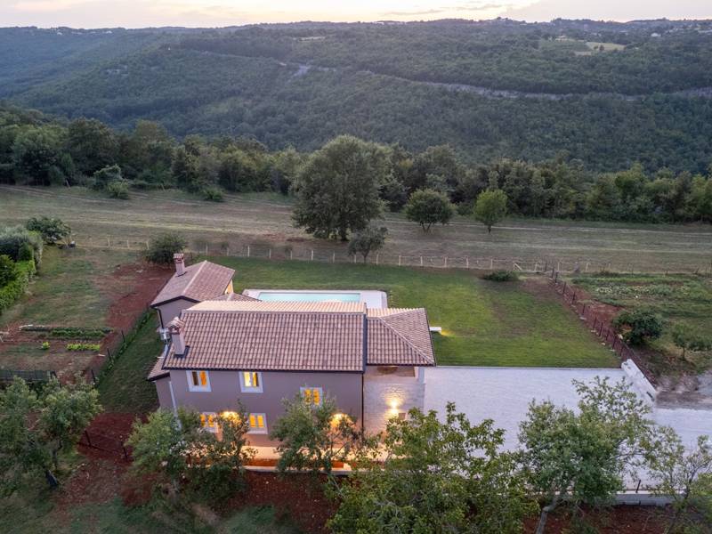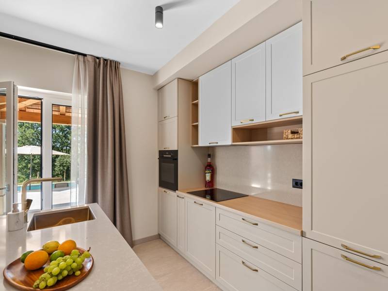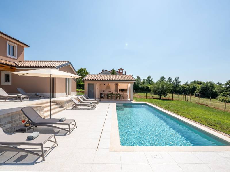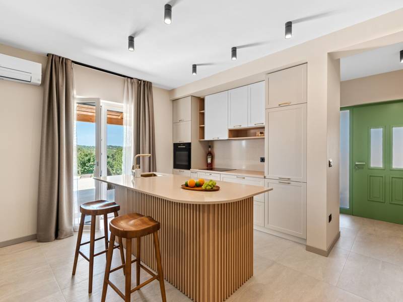 Villa Vita ligt in het hart van Istrië, net boven het charmante stadje Pazin. Het is een gloednieuw vakantiehuis met 3 slaapkamers en biedt een adembenemend uitzicht op de omliggende natuur. Met ruimte voor maximaal 8 gasten, combineert deze villa modern comfort met de serene schoonheid van het platteland - ideaal voor families, vrienden of koppels op zoek naar een rustig uitje. De villa ligt op een royaal privéperceel van 1.400 m2 en beschikt over 190 m2 prachtig ontworpen leefruimte op twee niveaus. De begane grond biedt een lichte, open woonruimte met een volledig uitgeruste keuken met kookeiland, een comfortabele lounge met grote tv en banken (om te bouwen tot een bed voor 2 personen), en een eetruimte die direct uitkomt op het terras bij het zwembad. Deze verdieping heeft ook een gezellige slaapkamer met een kingsize bed, tv, airconditioning, eigen badkamer en directe toegang tot het buitenterras. Boven vind je nog twee kingsize slaapkamers, elk met airconditioning, een tv en een eigen badkamer. Een van de kamers heeft ook toegang tot een privébalkon - perfect voor een kopje koffie 's ochtends met uitzicht. Stap naar buiten en geniet van je eigen privéoase: een sprankelend zwembad van 34 m2, een ruim zonneterras met 8 ligstoelen, een overdekte eethoek, een volledig uitgeruste zomerkeuken en een barbecue - ideaal voor ontspannen middagen en diners onder de sterren. Voor uw gemak is Villa Vita volledig voorzien van airconditioning en uitgerust met high-speed Wi-Fi, een wasmachine, strijkfaciliteiten en een eigen parkeerplaats. Hoewel de villa omgeven is door rust en natuur, ligt het op slechts een klein eindje rijden van de plaatselijke winkels, cafés en restaurants. De centrale ligging maakt het een perfecte uitvalsbasis voor het verkennen van het hele schiereiland Istrië - de meeste bestemmingen liggen op slechts ongeveer 30 minuten rijden. Kom tot rust, omarm de schoonheid van Istrië, en maak onvergetelijke herinneringen in Villa Vita - uw perfecte thuis weg van huis. Let op: Huisdieren zijn alleen op aanvraag toegestaan.
