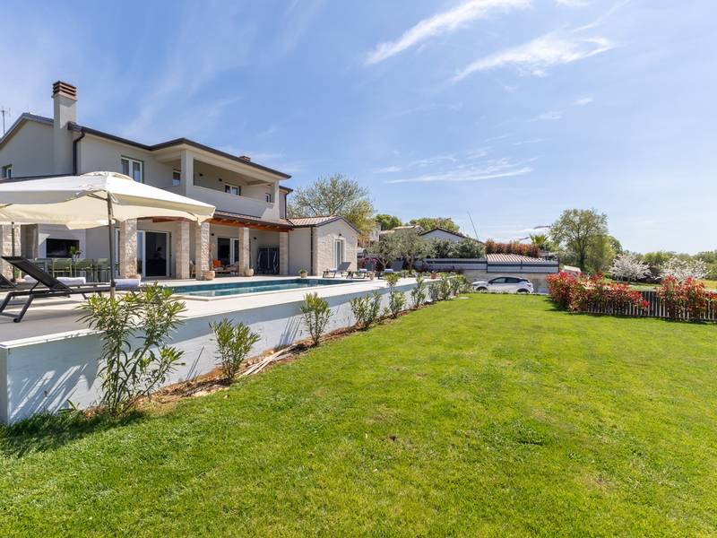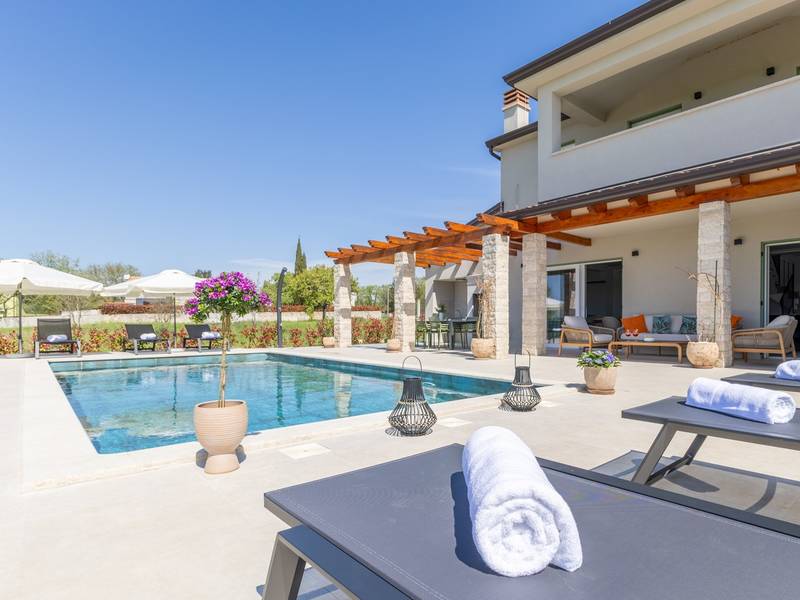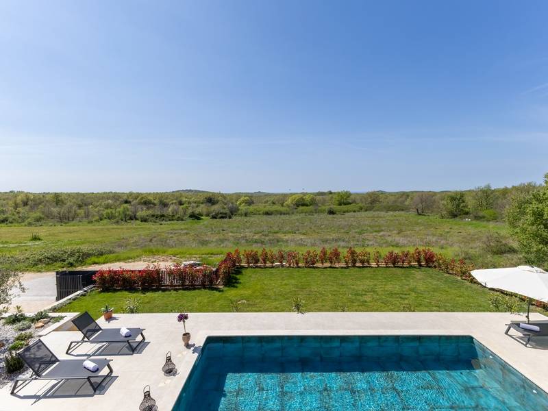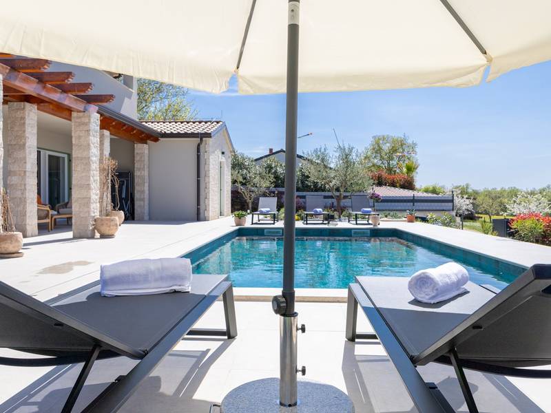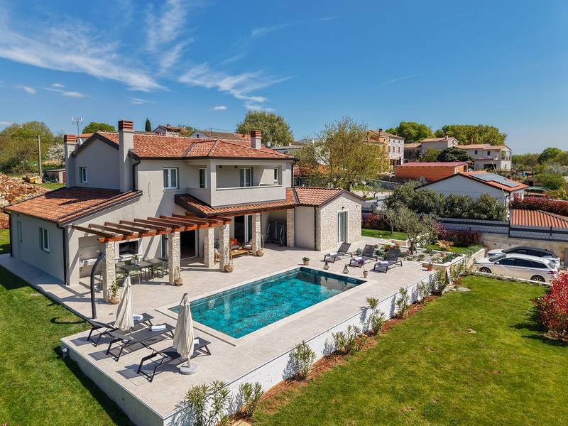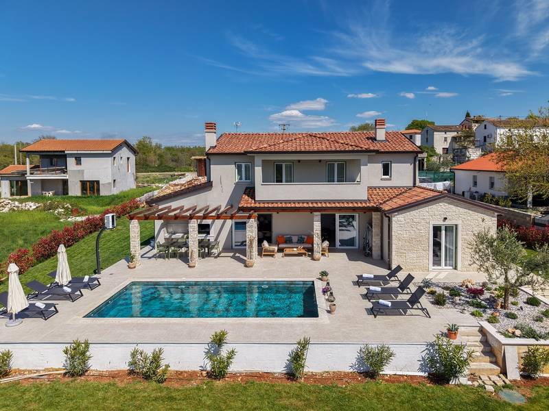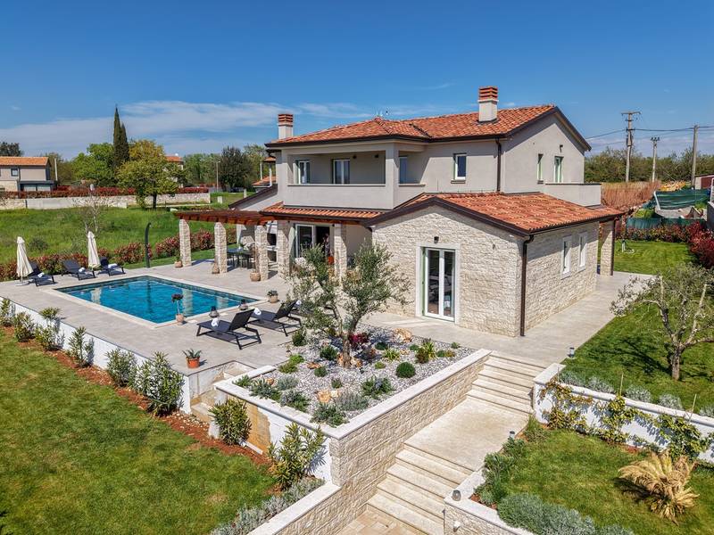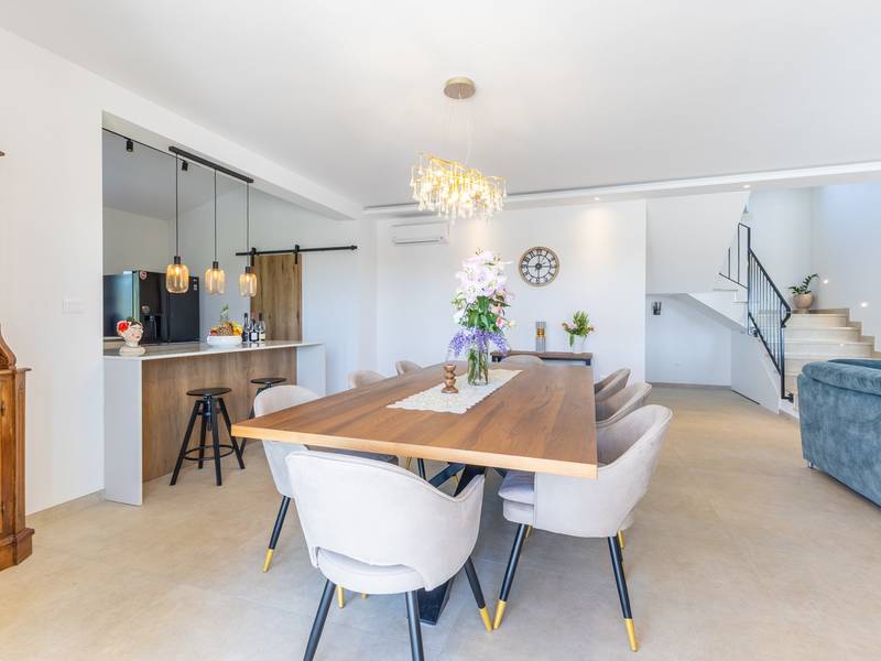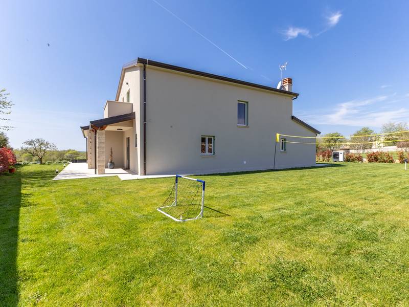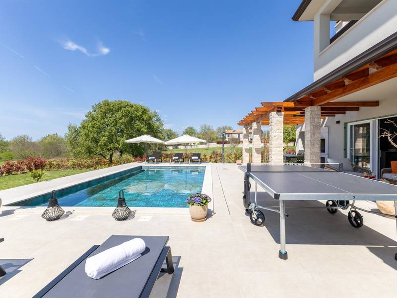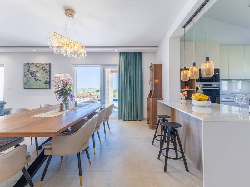 Gelegen in het rustige dorpje Kirmenjak, in de directe omgeving van Poreč, is dit moderne en elegante vakantiehuis de perfecte keuze voor een ontspannen verblijf in Istrië. Omgeven door groen en natuur, biedt het volledige rust, privacy en een betoverend uitzicht, vooral tijdens onvergetelijke zonsondergangen. Het huis is ontworpen met de nadruk op comfort en functionaliteit en is geschikt voor maximaal acht personen. Het heeft vier ruime slaapkamers, elk met een eigen badkamer, wat zorgt voor maximale privacy voor alle gasten. Het interieur is modern ingericht en van alle gemakken voorzien, en de ruime woonkamer die verbonden is met de eetkamer en moderne keuken vormt een centrale ontmoetingsplaats. Het huis is vooral waardevol vanwege de kinderspeelkamer, ideaal voor gezinnen met kinderen, evenals de buitenruimte, die zorgvuldig is ingericht om buiten te genieten. Aan de voorkant van het huis ligt een groot privézwembad (32 m2) omringd door ligstoelen en een zonneweide, perfect voor verfrissing tijdens warme zomerdagen. Privéparkeergelegenheid is ook beschikbaar voor gasten, en het hele pand straalt de harmonie uit van modern design en natuurlijke omgeving. Dit vakantiehuis is de ideale keuze voor iedereen die op zoek is naar een combinatie van luxe, comfort en authentieke Istrische sfeer, op slechts een paar minuten rijden van de zee en het pittoreske centrum van Poreč.