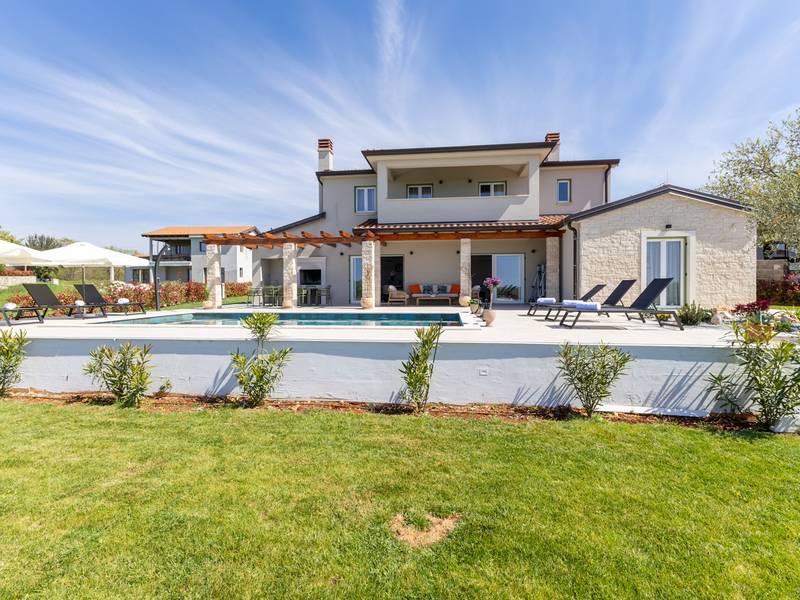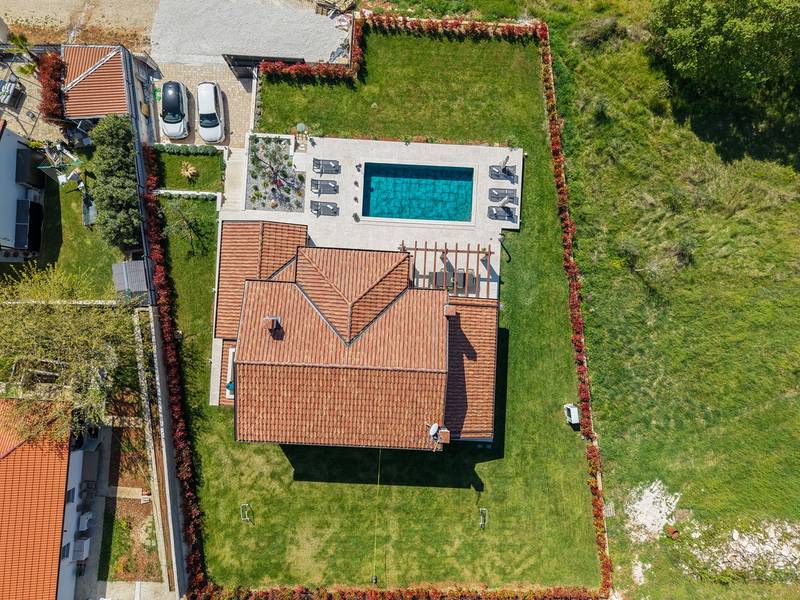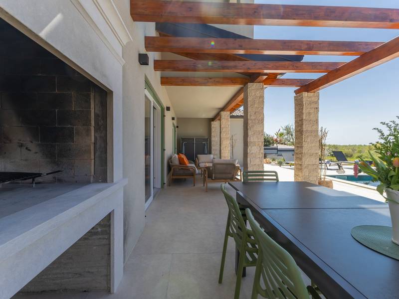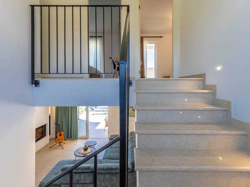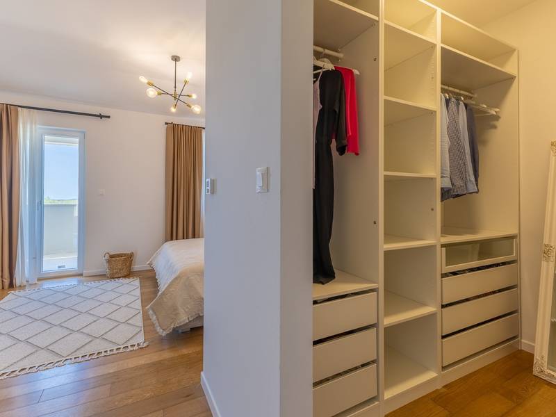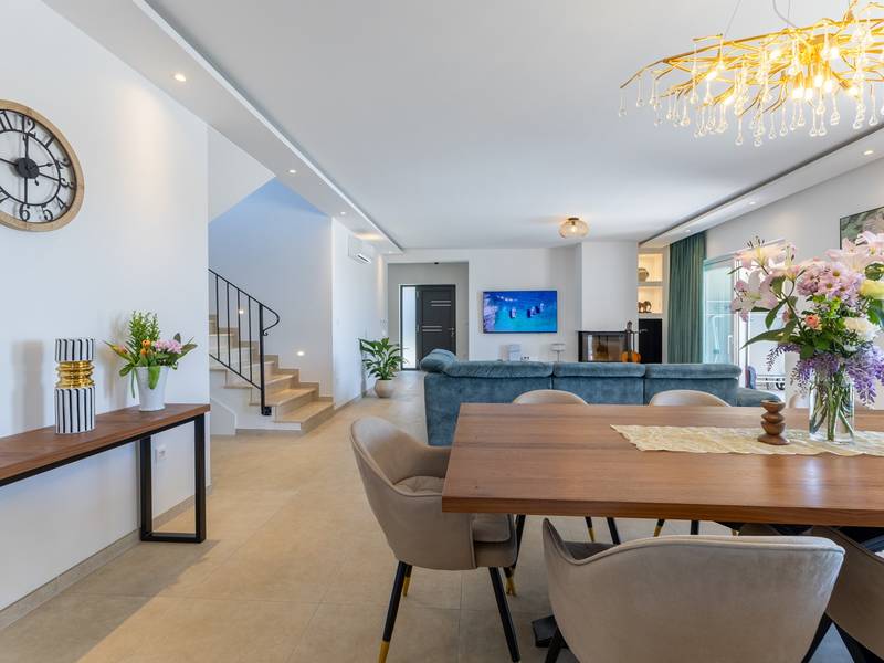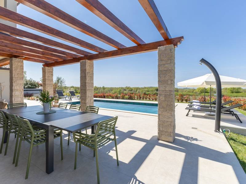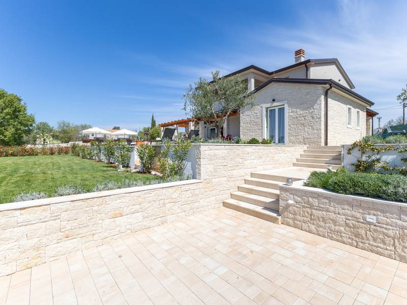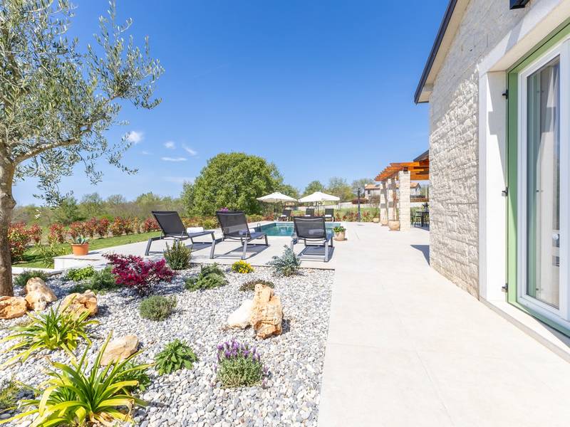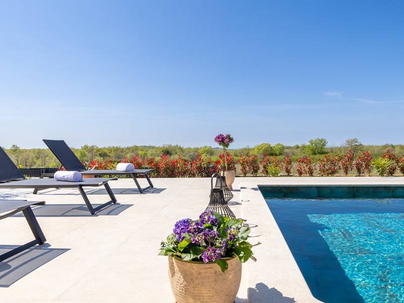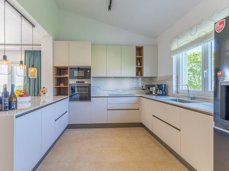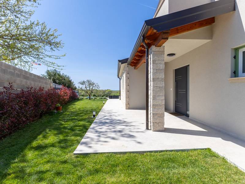 Gelegen in het rustige dorpje Kirmenjak, in de directe omgeving van Poreč, is dit moderne en elegante vakantiehuis de perfecte keuze voor een ontspannen verblijf in Istrië. Omgeven door groen en natuur, biedt het volledige rust, privacy en een betoverend uitzicht, vooral tijdens onvergetelijke zonsondergangen. Het huis is ontworpen met de nadruk op comfort en functionaliteit en is geschikt voor maximaal acht personen. Het heeft vier ruime slaapkamers, elk met een eigen badkamer, wat zorgt voor maximale privacy voor alle gasten. Het interieur is modern ingericht en van alle gemakken voorzien, en de ruime woonkamer die verbonden is met de eetkamer en moderne keuken vormt een centrale ontmoetingsplaats. Het huis is vooral waardevol vanwege de kinderspeelkamer, ideaal voor gezinnen met kinderen, evenals de buitenruimte, die zorgvuldig is ingericht om buiten te genieten. Aan de voorkant van het huis ligt een groot privézwembad (32 m2) omringd door ligstoelen en een zonneweide, perfect voor verfrissing tijdens warme zomerdagen. Privéparkeergelegenheid is ook beschikbaar voor gasten, en het hele pand straalt de harmonie uit van modern design en natuurlijke omgeving. Dit vakantiehuis is de ideale keuze voor iedereen die op zoek is naar een combinatie van luxe, comfort en authentieke Istrische sfeer, op slechts een paar minuten rijden van de zee en het pittoreske centrum van Poreč.