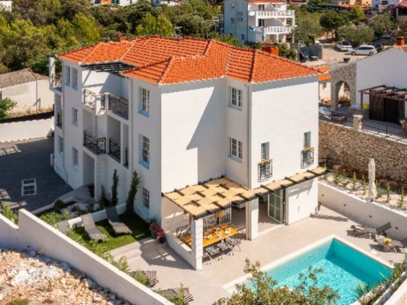 Villa Leylandii is een nieuw gebouwde luxe villa gelegen in het rustige kustplaatsje Ražanj, op slechts 50 meter van de zee en 400 meter van een kiezelstrand - perfect voor een ontspannen vakantie met familie of vrienden in de buurt van Rogoznica. De villa biedt 200 m2 woonruimte op een privéterrein van 630 m2 en is verdeeld over twee niveaus: de begane grond en de eerste verdieping. De begane grond beschikt over een volledig uitgeruste keuken, eethoek en een comfortabele woonkamer, evenals een extra zithoek met open haard, een slaapkamer en een apart toilet. Boven vind je drie ruime slaapkamers, elk met een eigen moderne badkamer, een extra badkamer, een apart toilet, een wasruimte en twee balkons met gedeeltelijk uitzicht op zee. Buiten kunnen gasten genieten van een verwarmd privézwembad met een geïntegreerde jacuzzi - ideaal om de hele dag te ontspannen. Villa Leylandii combineert comfort, elegantie en de nabijheid van de zee, waardoor het de perfecte bestemming is voor een luxe vakantie in Dalmatië.