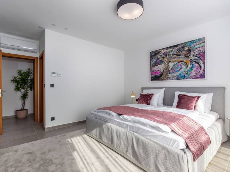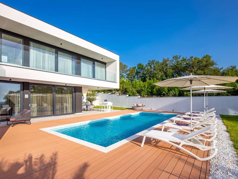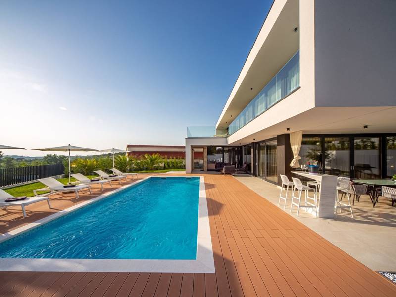 Welkom bij luxe Villa Eleven, een prachtige villa gelegen in Rovinjsko Selo, op slechts een klein eindje rijden van het strand en het bruisende centrum van Rovinj. Ontworpen met verfijning en ontspanning in het achterhoofd, belooft deze villa een vakantie-ervaring die zowel onvergetelijk als luxueus is. Bij binnenkomst op de begane grond word je begroet door een open lay-out met een volledig uitgeruste keuken, een eetkamer en een woonkamer met chique en modern meubilair. De ruimte wordt overspoeld met natuurlijk licht, dankzij de grote glazen ramen van vloer tot plafond die niet alleen het interieur verlichten, maar ook uitzicht bieden op de buitentuin. Villa Eleven biedt comfortabel plaats aan maximaal 10 gasten in de vier ruime slaapkamers. Twee van deze slaapkamers hebben een eigen badkamer, die privacy en luxe biedt, terwijl de overige twee een grote badkamer delen die is uitgerust met zowel een douche als een bad. Elke slaapkamer is ingericht met elegant meubilair en uitgerust met een flatscreentelevisie en airconditioning, waardoor je verzekerd bent van een goede nachtrust. Het ontwerp van de villa integreert de leefruimtes binnen met de buitenruimte buiten, zodat je kunt genieten van het prachtige mediterrane klimaat. Aan de buitenkant ligt een zwembad van 50 m², perfect om af te koelen op warme zomerdagen. Villa Eleven ligt op slechts 8 km van Rovinj en is een uitstekende uitvalsbasis voor wie de Adriatische kust wil verkennen en tegelijkertijd wil genieten van de rust en luxe van een privévilla. Of je je nu koestert in de zon bij het zwembad of de nabijgelegen attracties verkent, Villa Eleven biedt een perfecte mix van luxe, comfort en gemak voor een onvergetelijke vakantie.