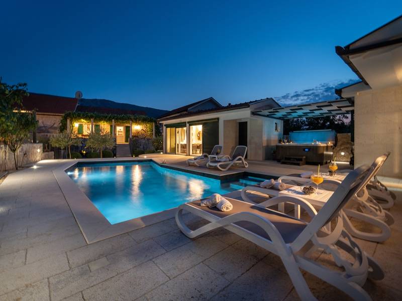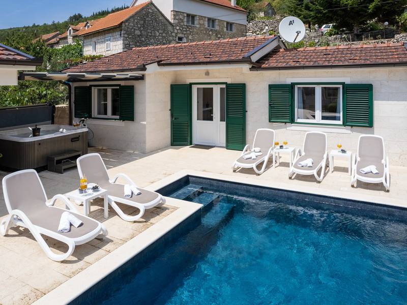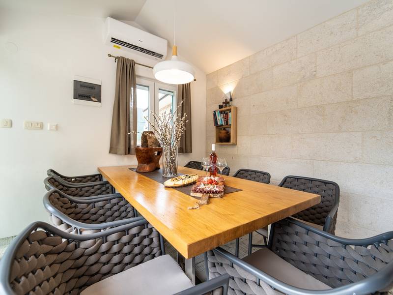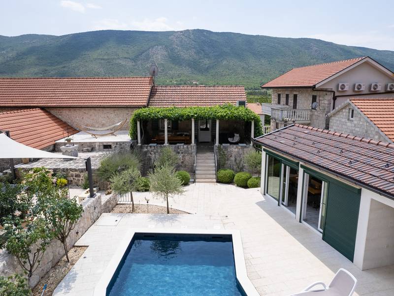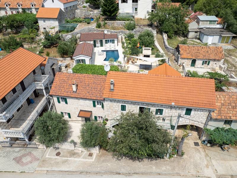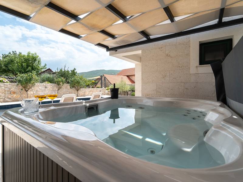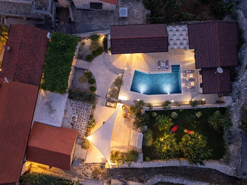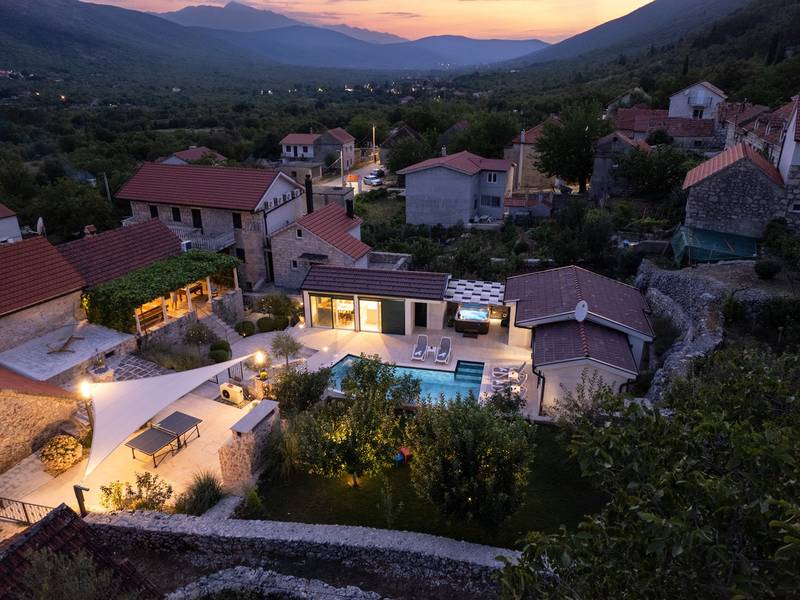 Genesteld in het charmante dorpje Slivno, Imotski, biedt Villa Aurora een perfect uitje in het hart van Dalmatië. Deze prachtig gerenoveerde traditionele stenen villa, gebouwd in 1911, beschikt over een verwarmd privézwembad van 28 m² met hydromassage, een Turkse sauna en een hot tub voor ultieme ontspanning. Stijlvol ontworpen en volledig uitgerust voor de moderne gast, verwelkomt deze villa ook uw viervoetige familieleden! Met 5 slaapkamers in twee met elkaar verbonden wooneenheden is het ideaal voor gezinnen en groepen. Op slechts 13 km van Imotski, 20 km van Makarska, 44 km van Omiš en 65 km van Split, de hoofdstad van de regio - Twee prachtige huizen die exclusief voor u worden aangeboden: - Hoofdwoning: - Op de begane grond met airconditioning vindt u een volledig uitgeruste moderne keuken, een eethoek en een gezellige woonkamer met een tv en een open haard, naast een familiebadkamer met een douche en een wasmachine en een Turkse sauna voor ultieme ontspanning. - Op deze verdieping bevindt zich ook een charmante kamer in ˝tavern˝-stijl, traditioneel ingericht en gevuld met eersteklas lokale wijnen om van te genieten. - De eerste verdieping beschikt over slaapkamer nr. 1 (11 m²) met een tweepersoonsbed, slaapkamer nr. 2 (8 m²) met een tweepersoonsbed en een eenpersoonsstapelbed (perfect voor kinderen), slaapkamer nr. 3 (6 m²) met een eenpersoonsbed. Vanuit het stenen huis heb je een heerlijk natuurlijk schaduwrijk buitenterras met een houten eettafel, een tafelvoetbalspel en een schommelende eierstoel met uitzicht op het zwembad - perfect om te genieten van die warme zomeravonden. - Pool Cottage: - Dit nieuwe gedeelte van het huis biedt een woon-/eetgedeelte met airconditioning en een volledig uitgeruste keuken met directe toegang tot het zwembad. Er zijn slaapkamers nr. 4 en nr. 5, beide met een tweepersoonsbed, een familiebadkamer met een douche en een wasmachine - Een overdekt gedeelte met een hot-tub (whirlpool) - Er is ook een volledig uitgeruste zomerkeuken met airconditioning en een eettafel voor 10 personen met glazen schuifdeuren naar het zwembad, en er is een apart toilet. Een ruime, met gras begroeide tuin verbindt de woningen en biedt een geweldige plek voor een kopje koffie in de namiddag of om te spelen met je huisdier. Geniet van vers fruit uit de tuin of steek de traditionele stenen grill aan voor een heerlijke barbecue, en vermaak je met een tafeltennistafel in de buitenlucht. De buitenterrassen zijn ideaal voor gezelligheid en entertainment. Aangrenzend wacht het prachtige buitenzwembad, compleet met een jacuzzi voor ultieme ontspanning. Ontspanning en amusement Villa Aurora is ook een spa oase, met: - Een Turkse sauna - Een verwarmd buitenzwembad - Een verjongende jacuzzi