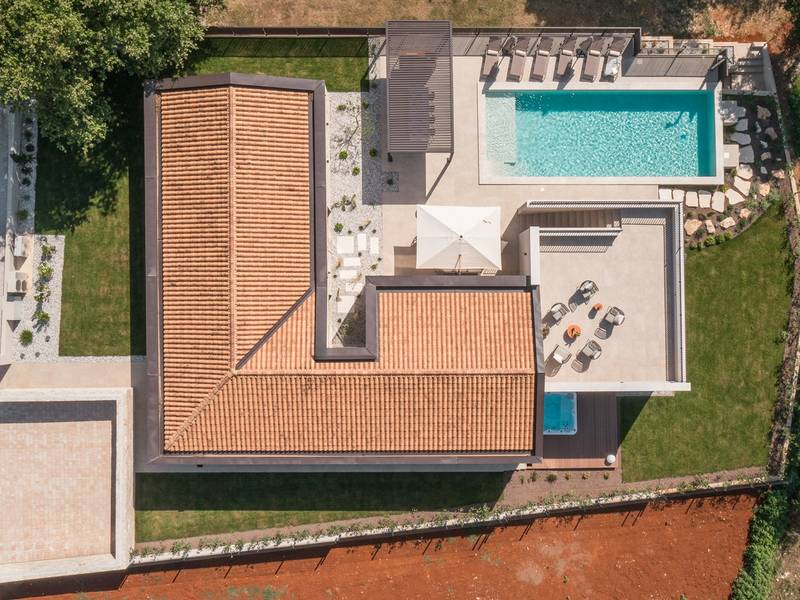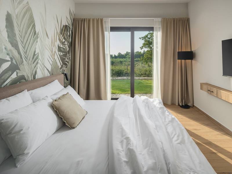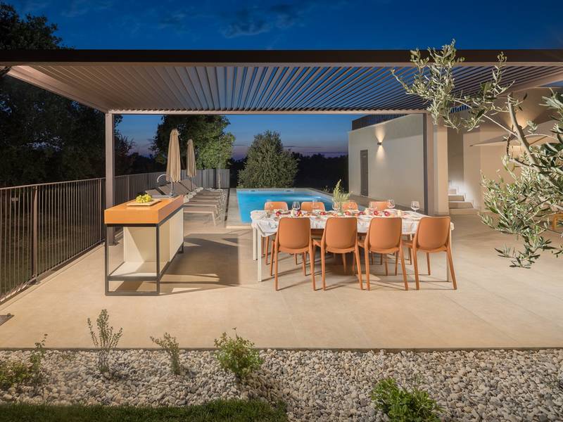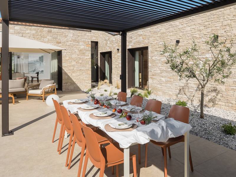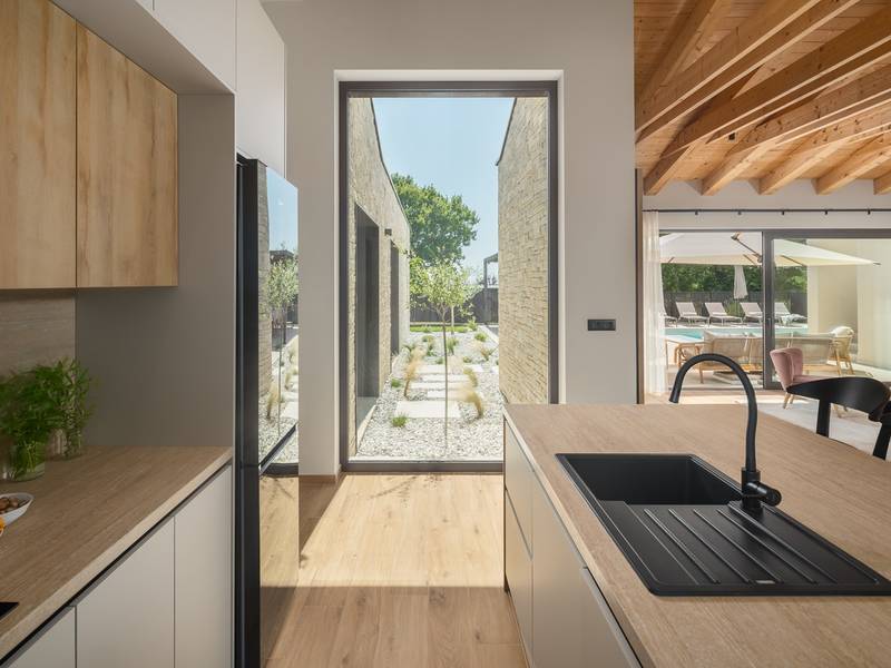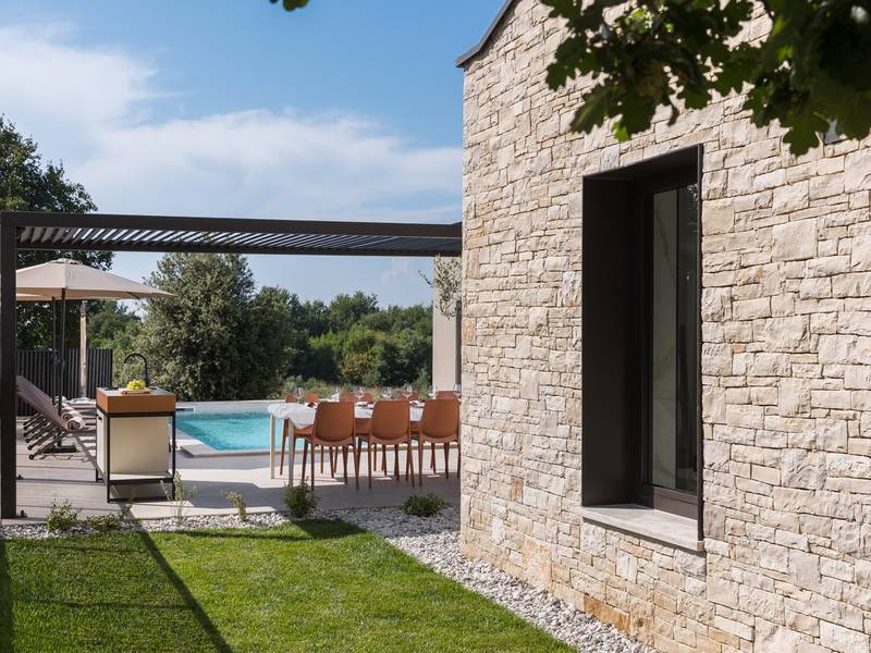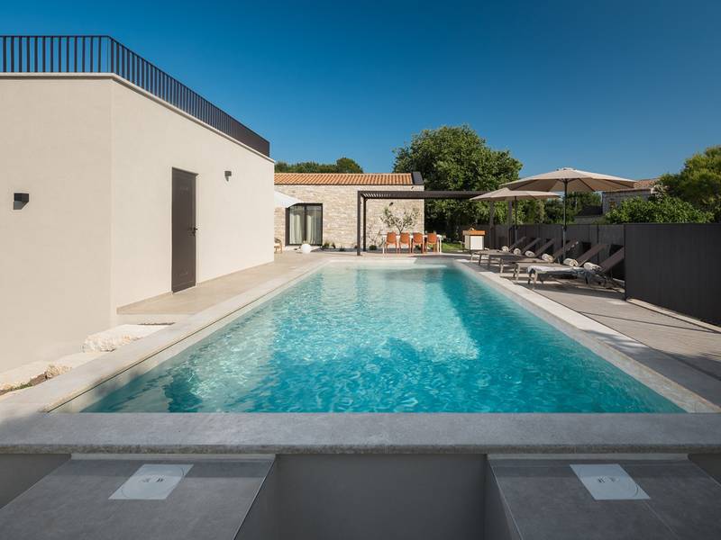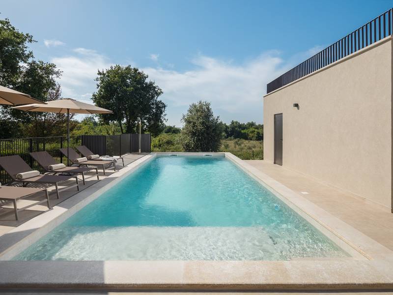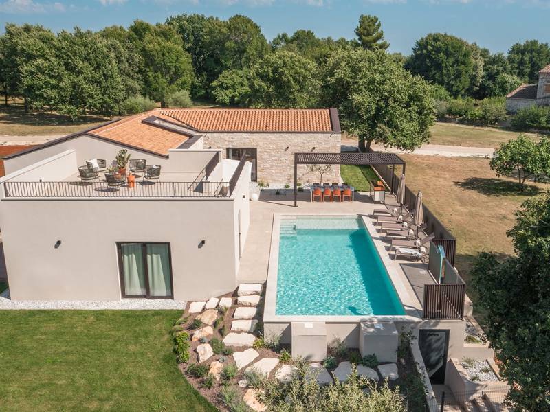 Luxe Villa Casa Maria, gelegen in het rustige dorpje Stancija Blek in de buurt van Tar-Vabriga, Istrië, combineert historische charme met moderne luxe. Omgeven door weelderig groen en een ruime privétuin, biedt de villa plaats aan maximaal 8 gasten in vier elegant ingerichte tweepersoonsslaapkamers, elk met een eigen en-suite badkamer. De open woonkamer heeft grote glazen ramen die uitkijken op een privézwembad van 50 m2, waardoor binnen- en buitenruimtes naadloos op elkaar aansluiten. Gasten kunnen ontspannen in de jacuzzi, genieten van de buitendouche, of tot rust komen in de spa met een emotionele douche. Een dakterras biedt een prachtig uitzicht op zee, terwijl privéparkeergelegenheid zorgt voor gemak. Het dichtstbijzijnde strand ligt op slechts een paar minuten afstand, en lokale restaurants, fietspaden en kustpromenades zijn gemakkelijk bereikbaar, waardoor Villa Casa Maria een ideale bestemming is voor een luxe en ontspannen Istrische ontsnapping.