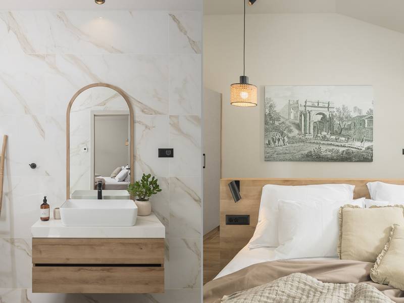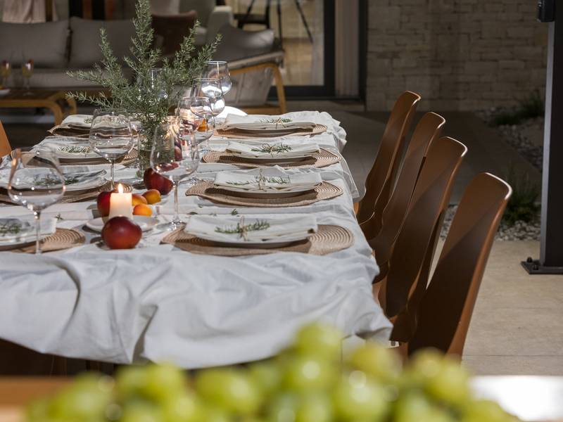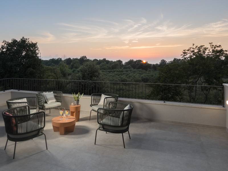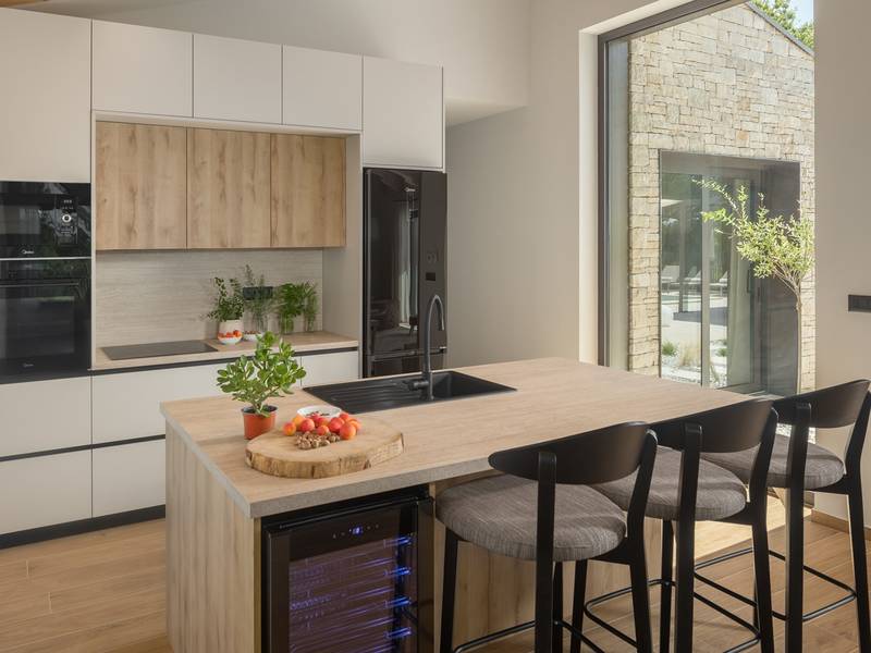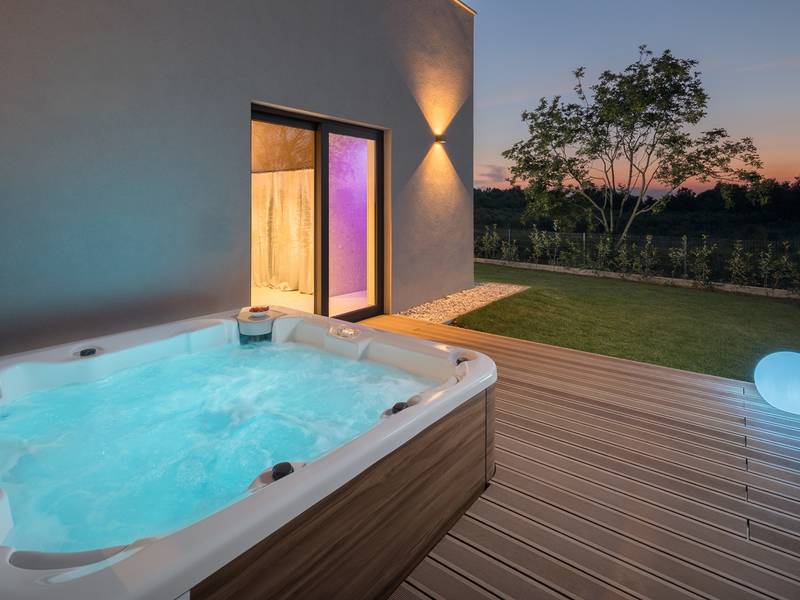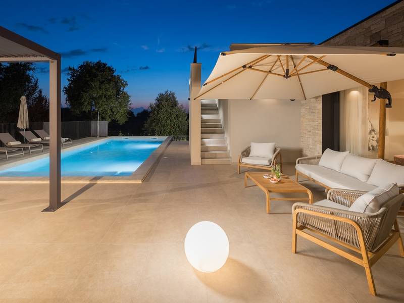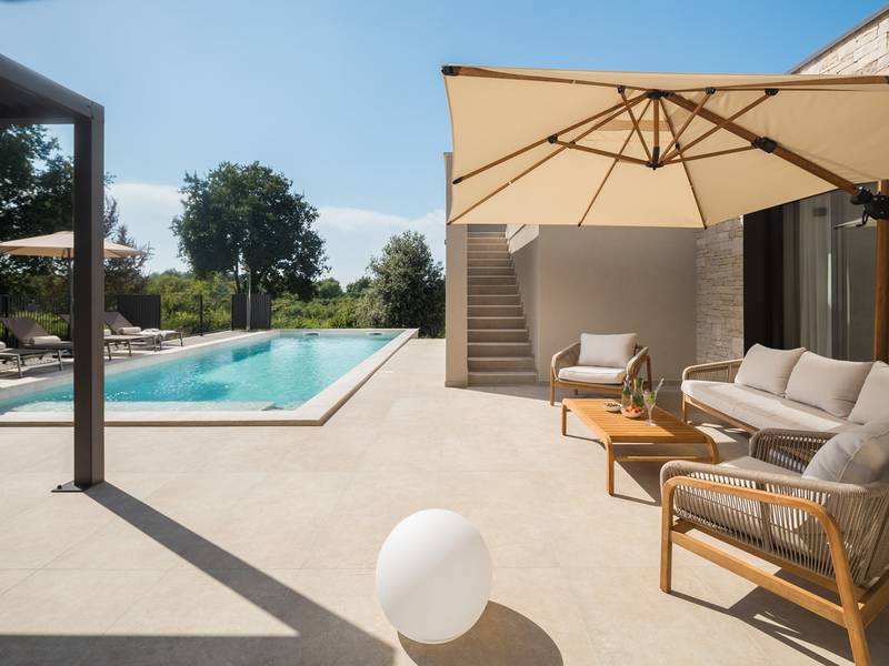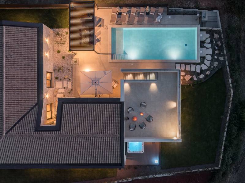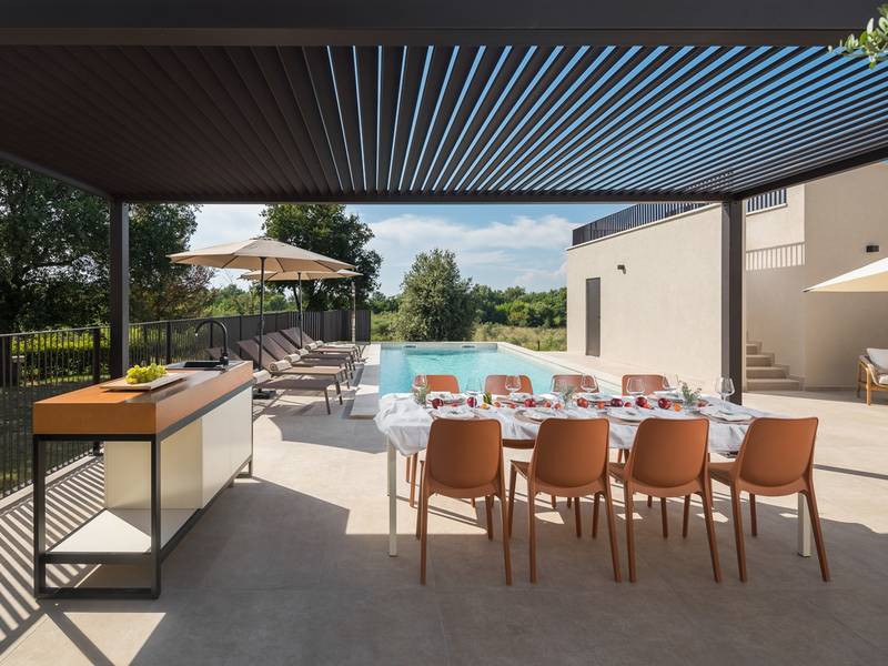 Luxe Villa Casa Maria, gelegen in het rustige dorpje Stancija Blek in de buurt van Tar-Vabriga, Istrië, combineert historische charme met moderne luxe. Omgeven door weelderig groen en een ruime privétuin, biedt de villa plaats aan maximaal 8 gasten in vier elegant ingerichte tweepersoonsslaapkamers, elk met een eigen en-suite badkamer. De open woonkamer heeft grote glazen ramen die uitkijken op een privézwembad van 50 m2, waardoor binnen- en buitenruimtes naadloos op elkaar aansluiten. Gasten kunnen ontspannen in de jacuzzi, genieten van de buitendouche, of tot rust komen in de spa met een emotionele douche. Een dakterras biedt een prachtig uitzicht op zee, terwijl privéparkeergelegenheid zorgt voor gemak. Het dichtstbijzijnde strand ligt op slechts een paar minuten afstand, en lokale restaurants, fietspaden en kustpromenades zijn gemakkelijk bereikbaar, waardoor Villa Casa Maria een ideale bestemming is voor een luxe en ontspannen Istrische ontsnapping.